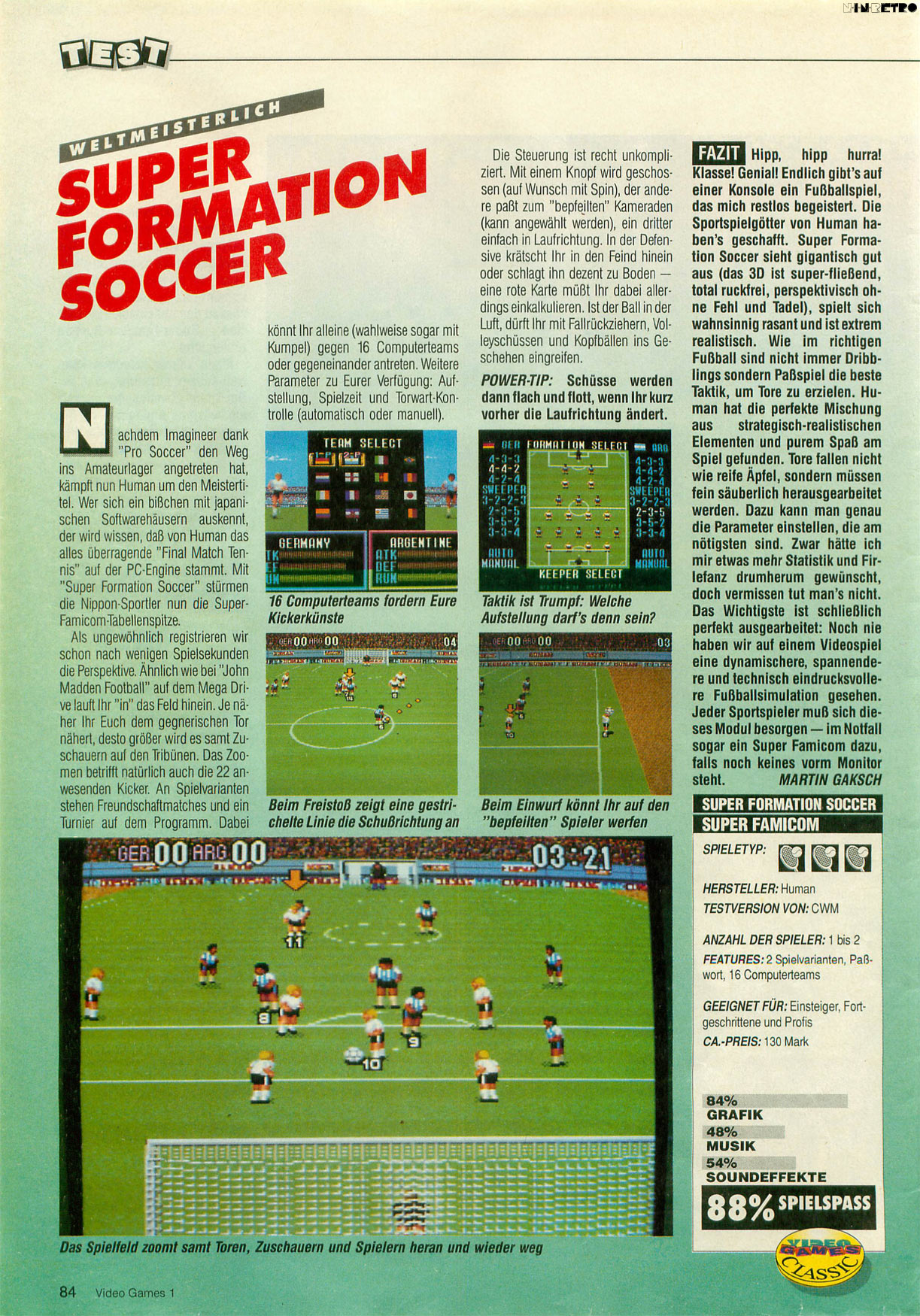 Eines der ersten (wenn nicht sogar das erste ?) Fußballspiel für das SNES und dafür auch sehr gelungen, vor allem aufgrund des Mode-7-Spielfeldes. Später gab es dann natürlich ganz andere Kaliber wie z.B. International Superstar Soccer Deluxe.