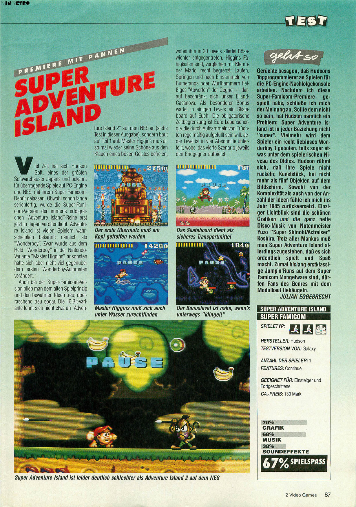 Super Adventure Island war, wenn ich mich richtig erinnere, das zweite Spiel, das ich für das Super Nintendo hatte (Super Mario World, war bei meiner Launchkonsole bzw. bei dem ersten SNES-Verkaufsversionen im Bundle mit dabei ). Hat mir damals auf jeden Fall extrem viel Spaß gemacht, vor allem die Hintergrundmusik gefiel mir damals extrem gut und motivierte immer wieder zum Weiterspielen. Allerdings muss ich dem VG-Testbericht Recht geben, im Vergleich zu Adventure Island II für NES, das fast zeitgleich in Europa erschien, war das erste 16-Bit-Adventure-Island vom Gameplay in der Tat leider ein Rückschritt. Zum Glück kannte ich die Vorgänger damals noch nicht, von daher konnte ich auch nicht vergleichen. Im Nachhinein allerdings schade, dass es nicht mal die Reittiere in die SNES-Version geschafft haben. Dennoch, ich denke, wer ein Fan vom ersten Wonder Boy oder von Adventure Island Classic bzw. dem ersten Adventure Island (das inhaltsgleich zu Wonder Boy ist)ist, dem dürfte Super Adventure Island auf jeden Fall gefallen.