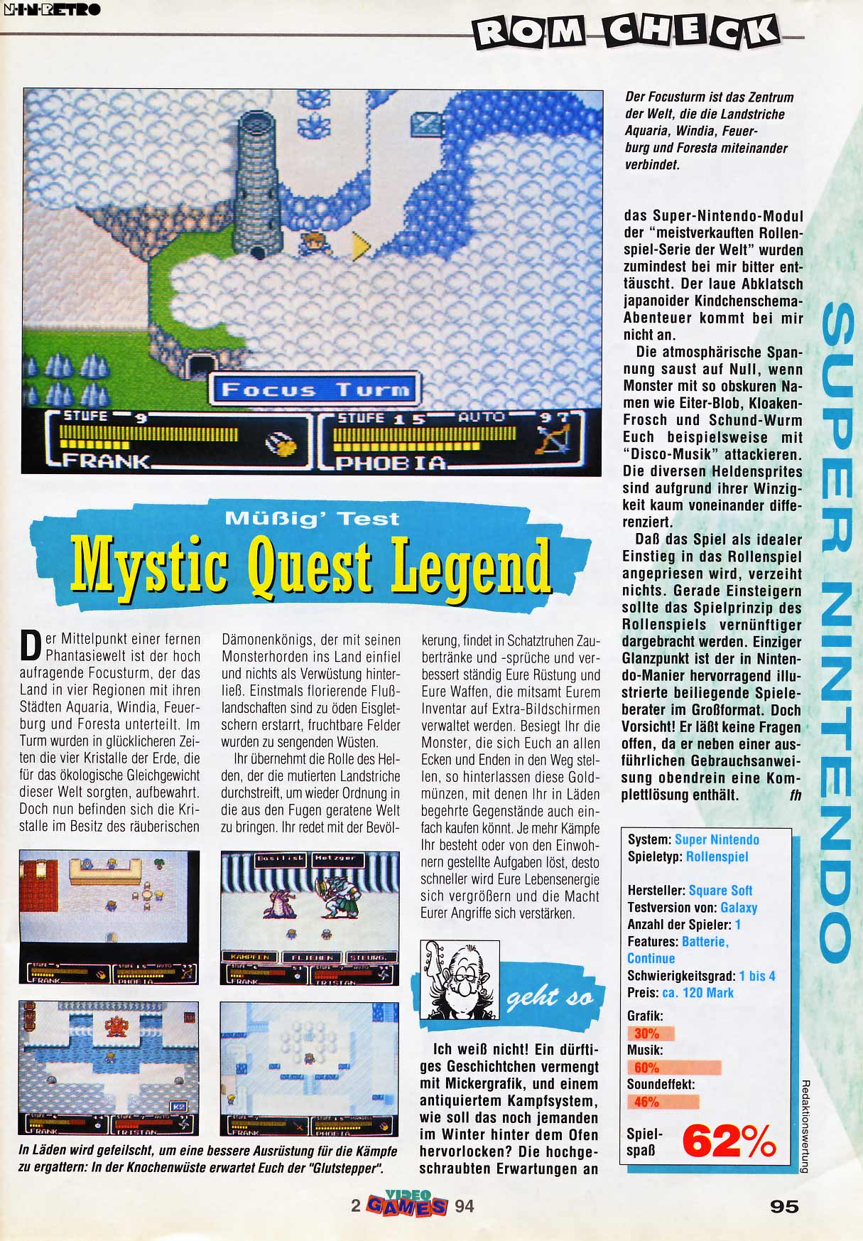 Nur Du kannst die Welt vor dem Untergang bewahren. Der Dämonen-König verschlingt das Licht der Erd-Kristalle. Das ist alles andere als ein Spaziergang, das ist das Abenteuer von dem noch die nächsten Generation sprechen werden. Dich erwarten die hinterhältigsten, erbarmungslosesten und gemeinsten Kreaturen Deiner Welt. Mystic Quest Legend ist Teil einer der erfolgreichsten Rollenspiel-Serien überhaupt.