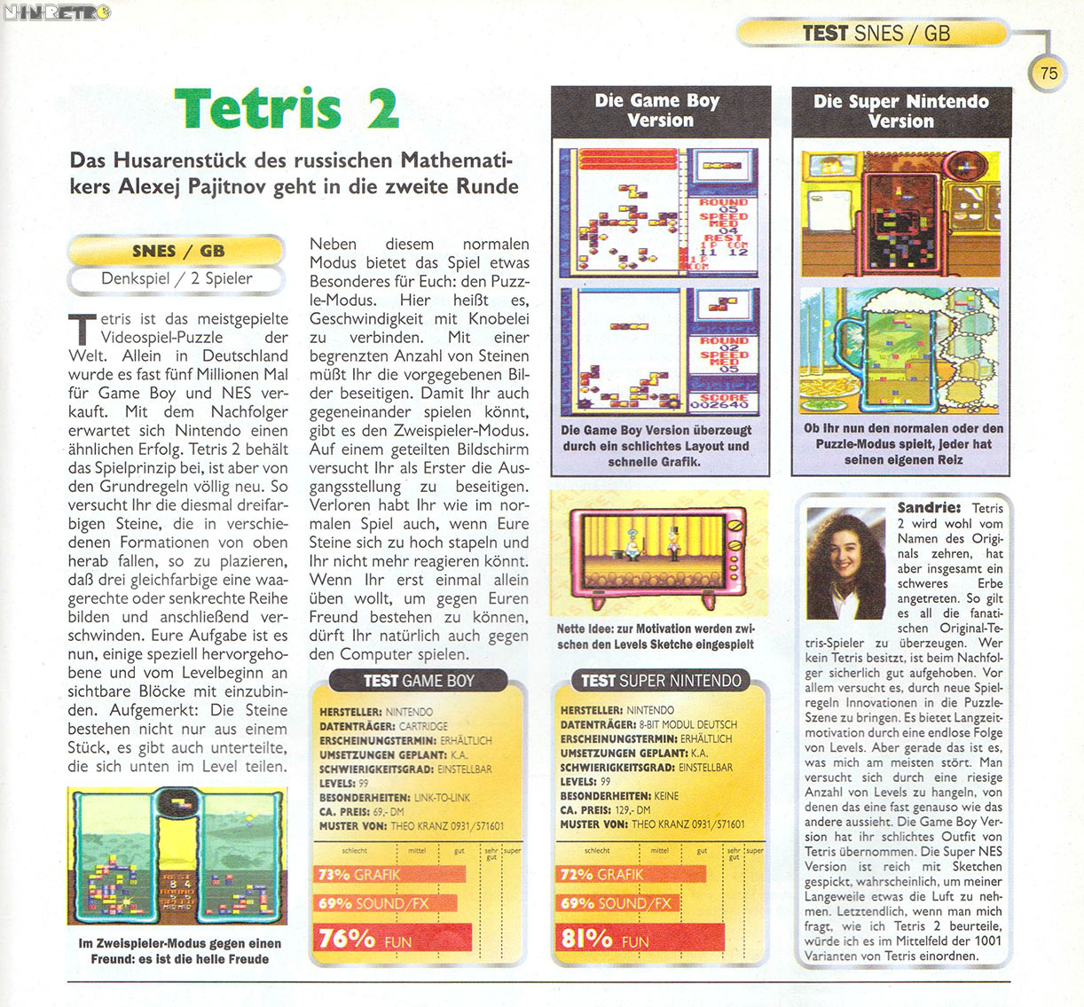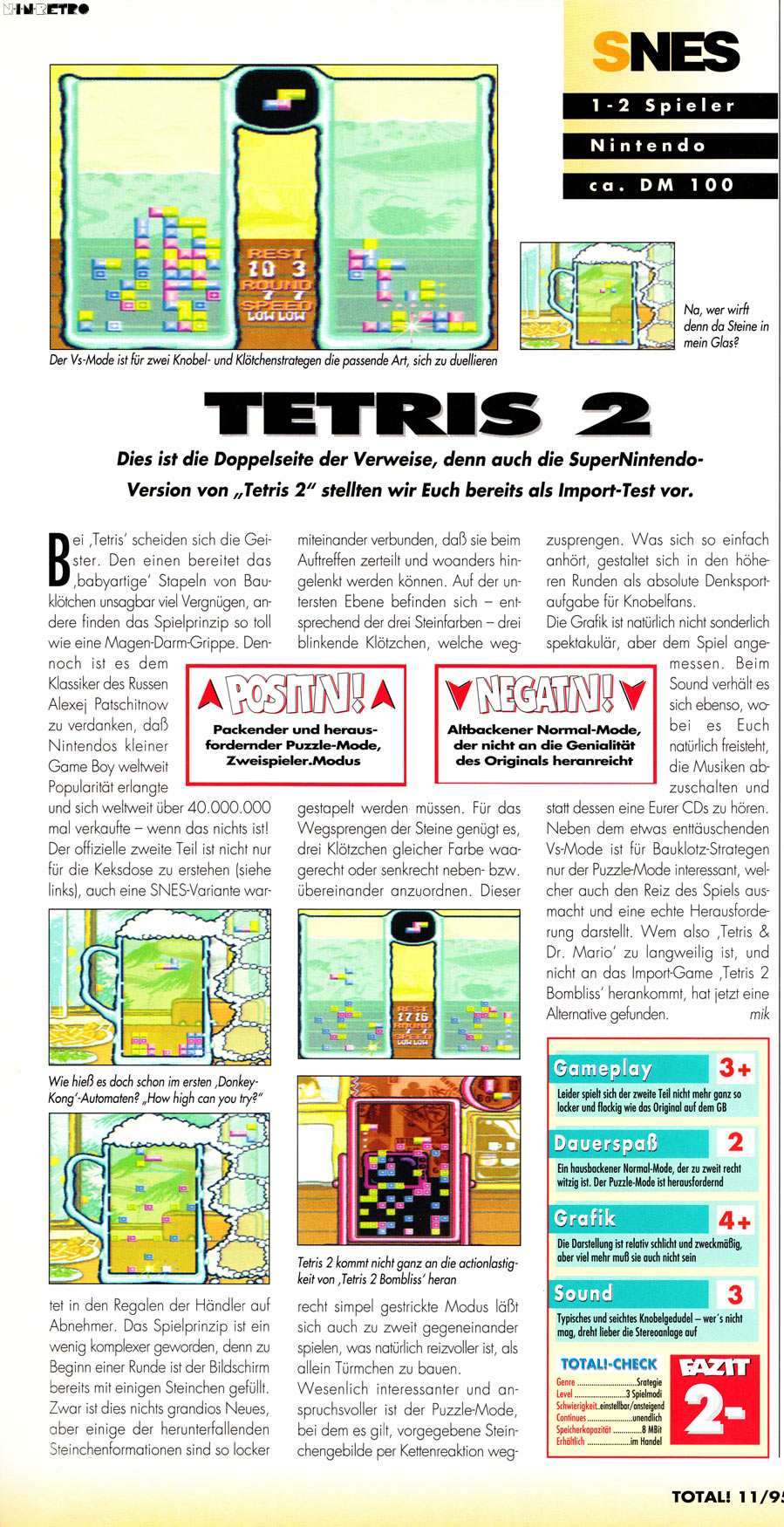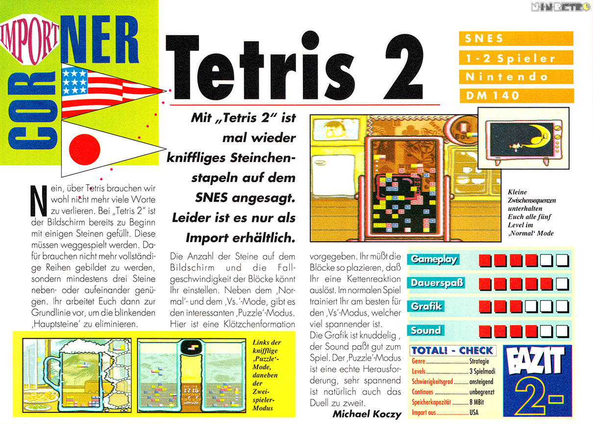 Tetris 2 fehlt die Leichtigkeit des Gameplays, die Einfachheit des Spielprinzips. So ist es oft nur Zufall, wie man zum Erfolg kommt. Trotzdem: Es gewisses Suchtprinzip eröffnet sich auch beim zweiten Tetris-Teil. Wer diese Spiel, sollte mal rein schauen. Teuer ist das Spiel nicht.