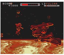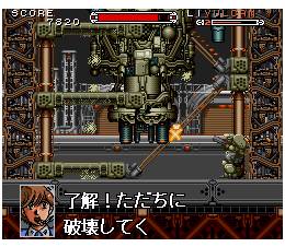 But you must fight on, toughing it out through 7 war zones stretching from the moon, through the expanses of space, to the fringes of Earth's fragile atmosphere. Crush Axis Cybertroops. Find your way through a dark mountain maze with only your wits and a small light. And capture power-ups that you can allocate to the Cybernator's four different weapons systems. Until you accomplish your mission. Or have your nuts and bolts plattered from here to eternity.
