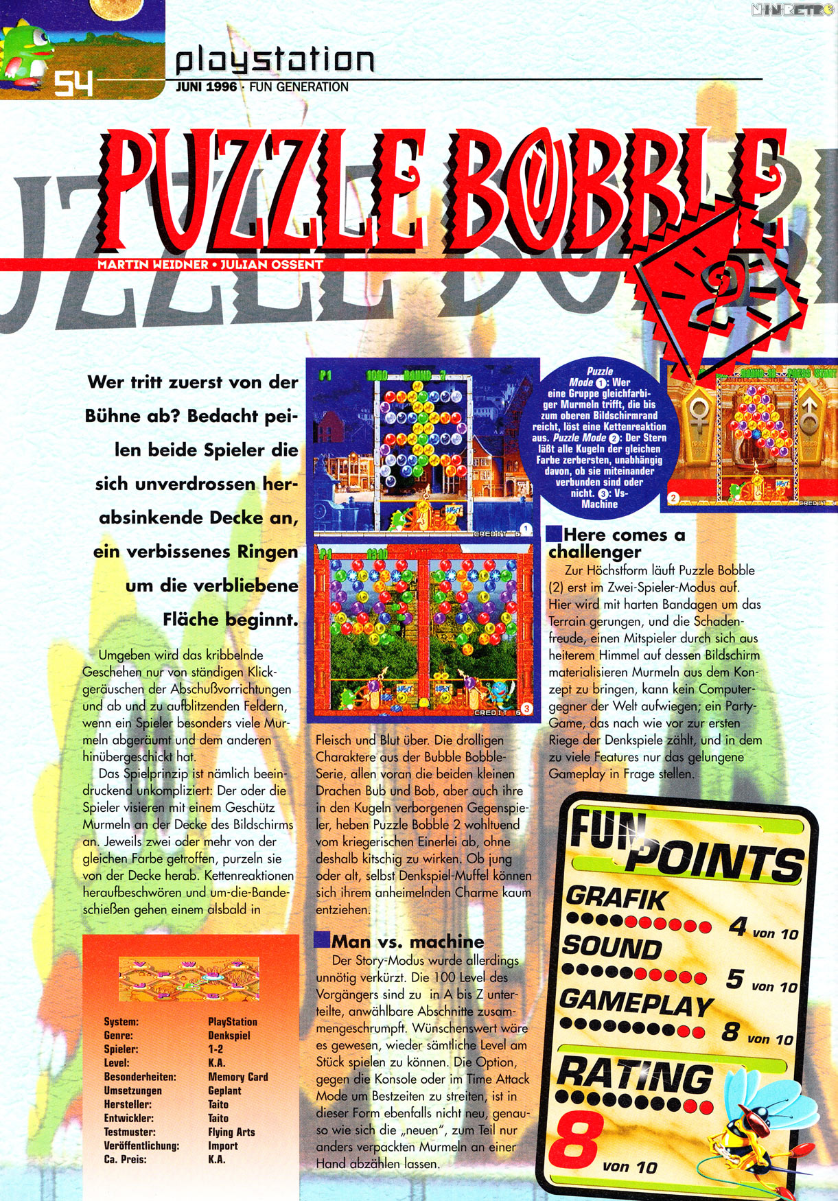 Das Cover der US-Fassung ist ja mal abgefahren. Schade, dass die Aufmachung des Spiels selbst überhaupt nicht dazu passt. Entsprechende Grafiken, untermalt von Avantgarde-Industrial-Sounds und spinnerten Sprachsamples, könnte ich mir eigentlich ganz cool vorstellen. Taito, mein Vorschlag für den nächsten Bust-A-Move-Ableger!