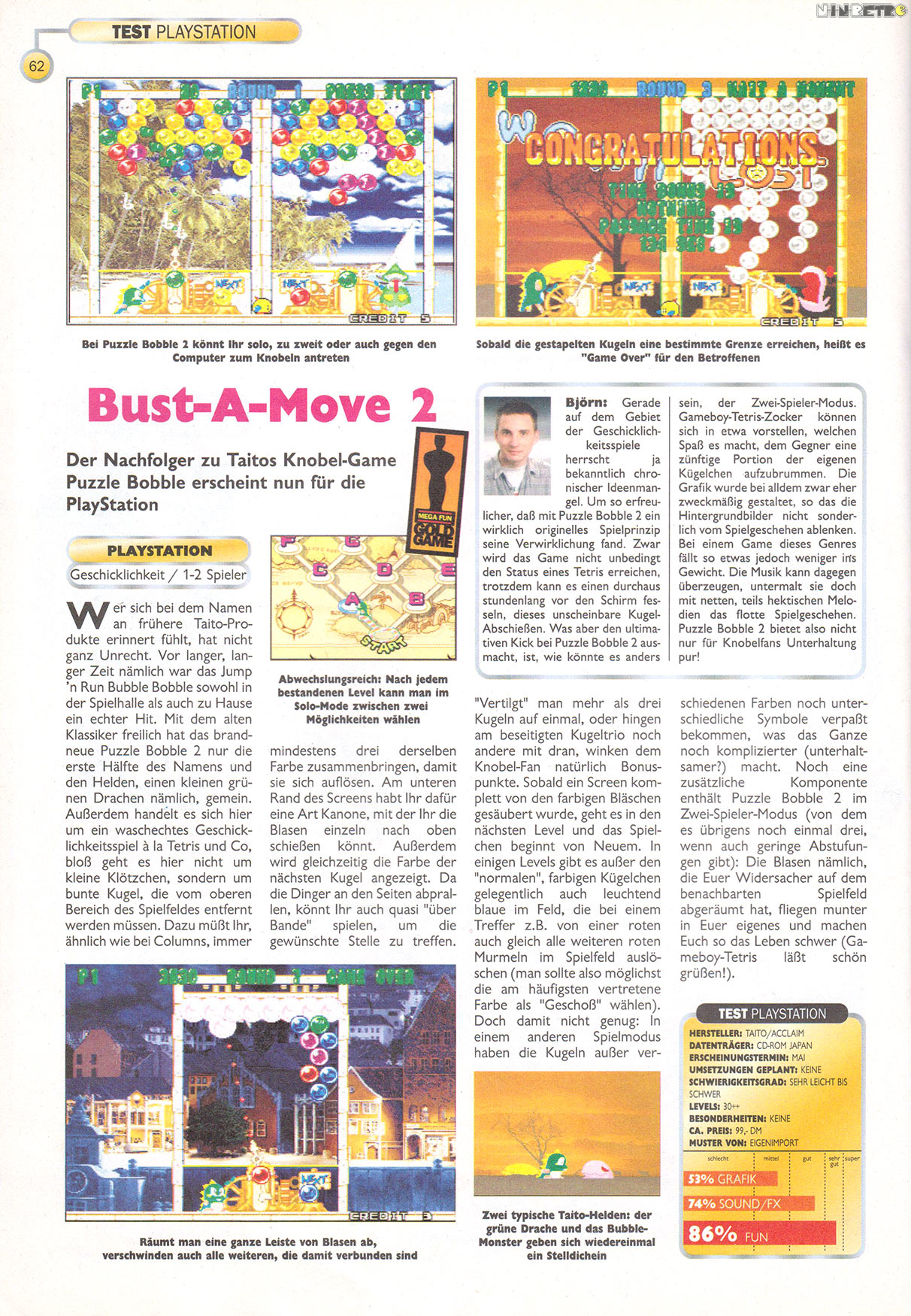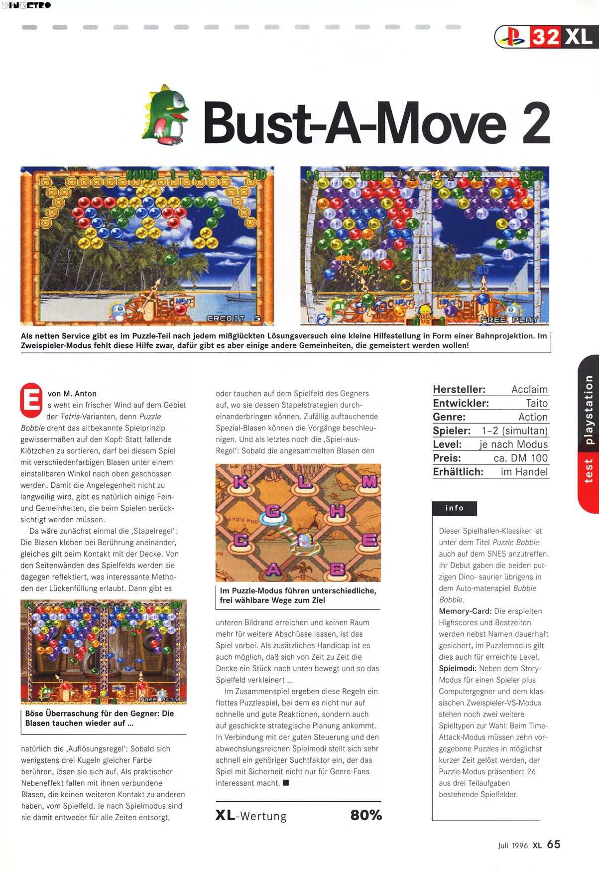BUST-A-MOVE 2 is the lightning-quick, ultra-intense, 100% addictive, arcade puzzler that's gonna grab you and never let go! As the balls descend, you're gonna need sharp eyes and quick reflexes to match 3 or more balls and pop them... fast! Insane two-player action pits you against an opponent in a race to bust or be busted!!