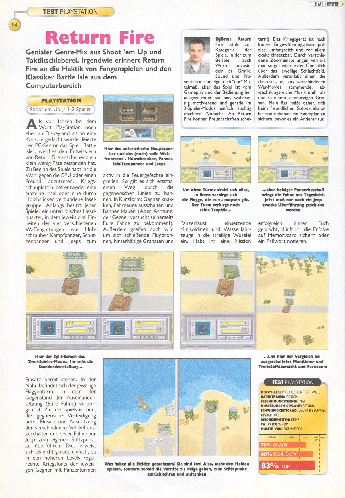 In Return Fire, you are face to face with your enemy, locked in bloody battle. Using helicopters, tanks, armored support vehicles (ASVs)and humvees, your mission is to infiltrate hostile territory, find the enemy flag hidden in a secret bunker and return to base. But the attack is not onesided. From the first shot, your enemy is mobilizing its forces in an equally fierce attempt to reach your flag and return with it. Casualties mount. Destruction is everywhere. In this battle, the side with superior tactics and firepower will prevail. The other will burn.