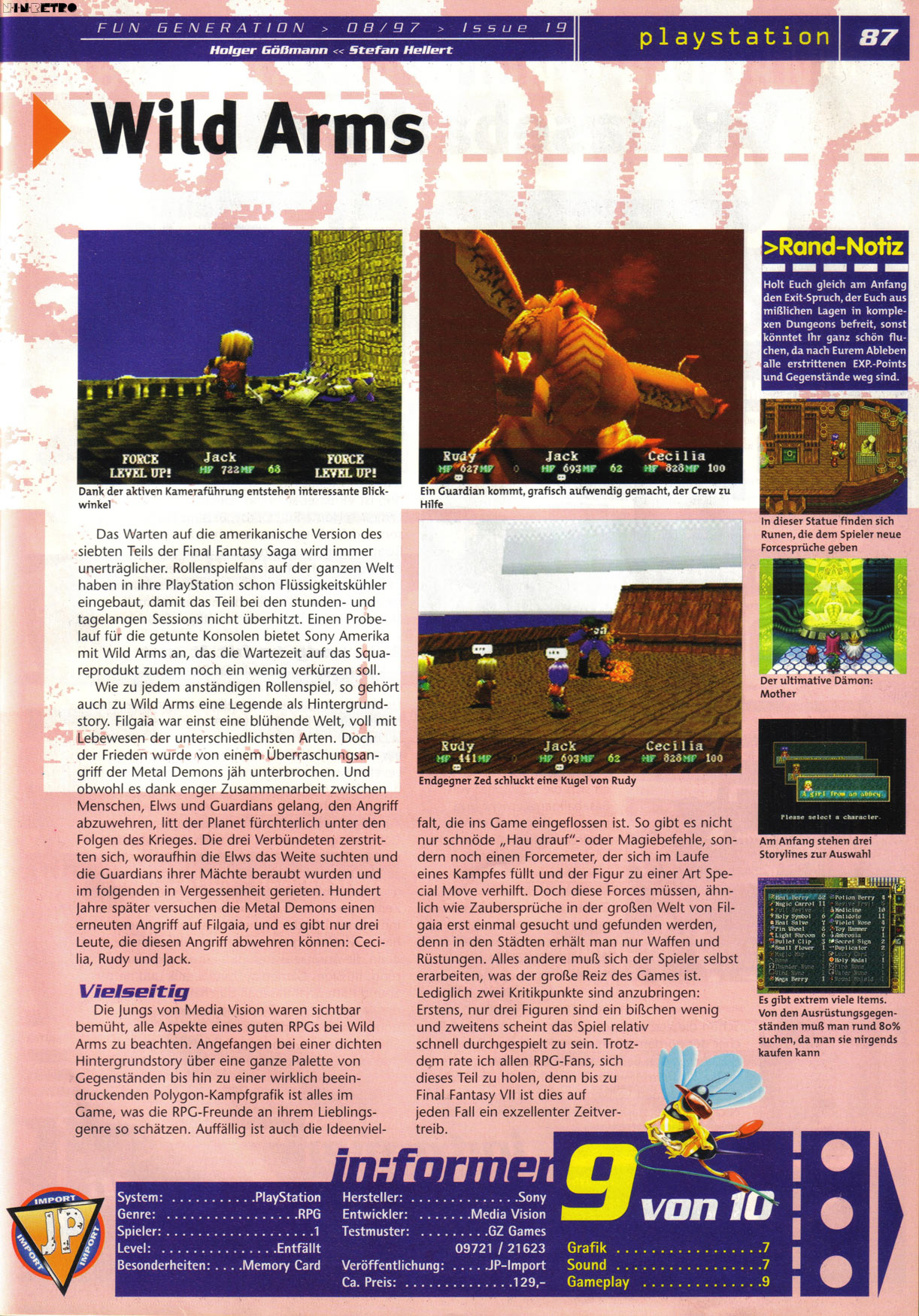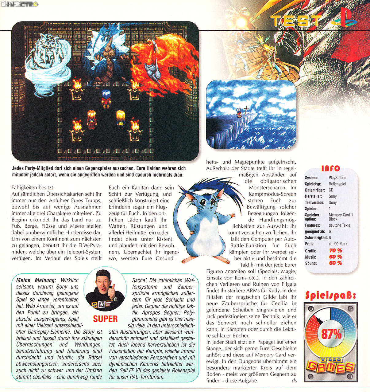 Ein wirklich tolles Spiel. Am meisten ist mir das Intro in Erinnerung geblieben. Sauber animiert und cooler Sound. Die Story hat mir sehr gefallen. Problematisch fand ich die damals schon schlechte Technik. Das ist natürlich dem frühen Release anzulasten. Aber die 3D-Kämpfe sehen wirklich fürchterlich aus. Ich bin eindeutig SNES-verwöhnt. Ich habe lieber eine schöne und sauber animierte 2D-Umgebung in den Kämpfen, als dieses Pseudo-3D mit seinen abgehackten Bildern. Schlimm...jaja. Nun ist es aber die eingängige Geschichte die RPG´s eben spielenswert machen. Und daher muß man Wild Arms einfach empfehlen.