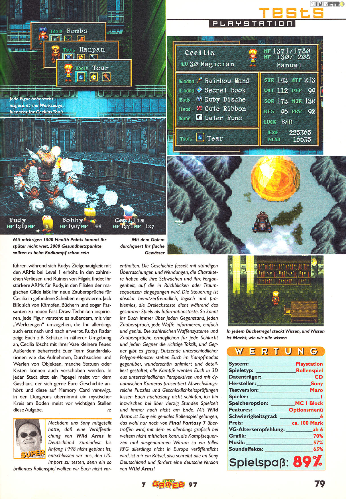 Eines der ersten RPGs für die Playstation. Mir hat's gut gefallen auch wenn ich es etwas kurz fand - in 30 Stunden hat man wirklich alles gesehen. Die Sache mit den Werkzeugen brachte Farbe ins Spiel und die Kämpfe waren insgesamt hübsch in Szene gesetzt. Bedauerlich am Spiel ist eigentlich nur das Rätel, das gelöst werden muss, um Rudy zu retten/helfen: zwei Räume, einer mit fünf Bücherregalen und einer mit fünf Schatztruhen (leer)...ja und jetzt darf jeder der will nachdenken, was zu tun ist. Ich wäre hier am liebsten Amok gelaufen...