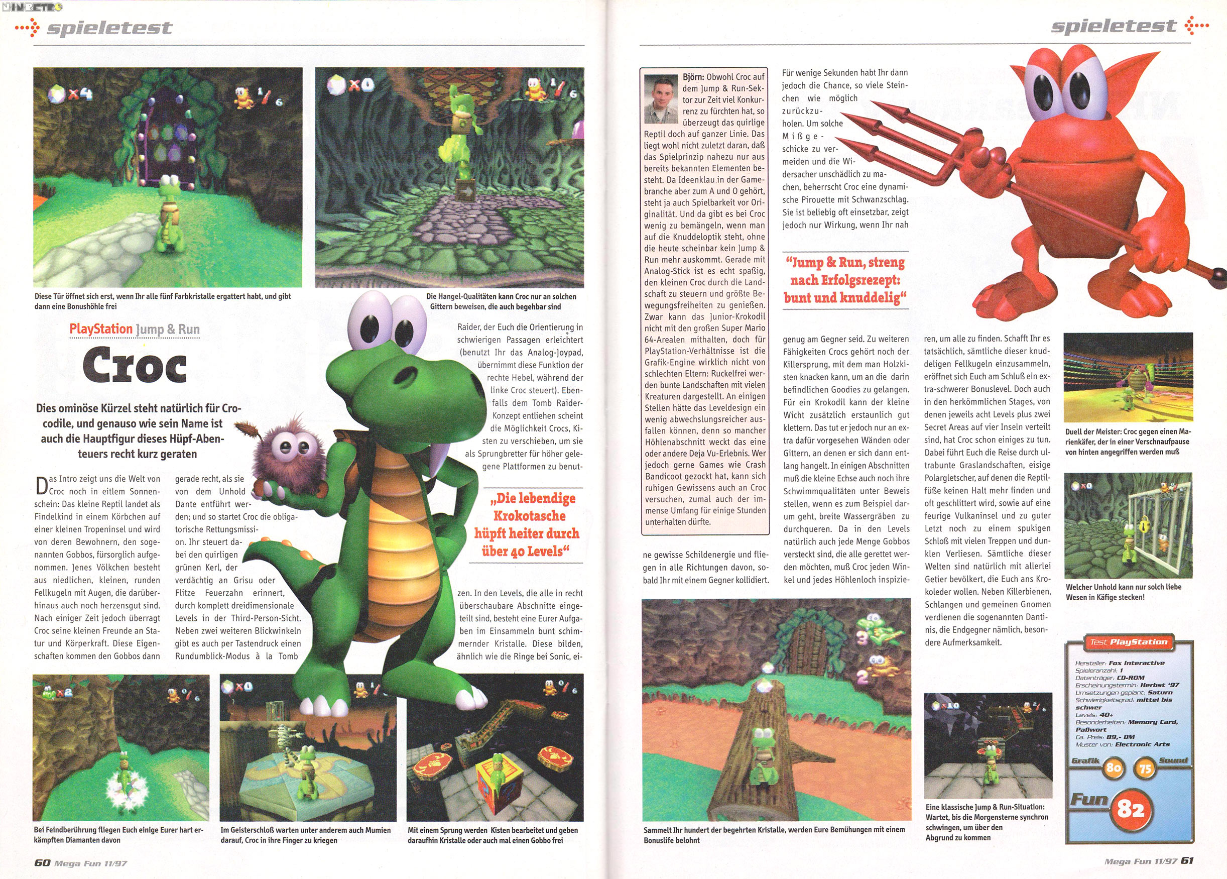 Help Croc, the crusading crocodile, rescue his peace-loving Gobbo Islander friends from the grasp of the evil magician Baron Dante. Six different 3D worlds to explore, including volcanoes, forests, ice glaciers and underwater caves, each with its own unique elements, terrifying monsters and mind-boggling obstacles.