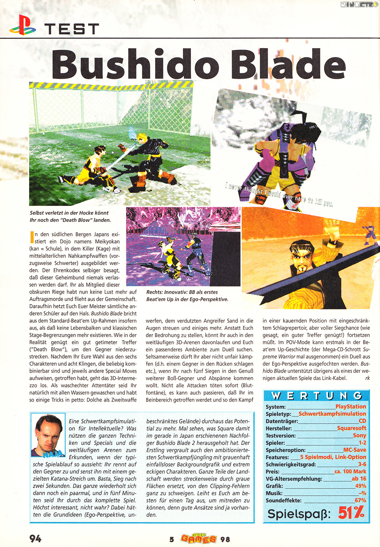 Die schlechte Kritik der Magazine und mancher Spieler zeigt deutlich wie platt und anspruchslos einige Prügler sehen. Bushido Blade hat einen hohen Anspruch...wahrscheinlich zu viel für Deutsche Spieler.