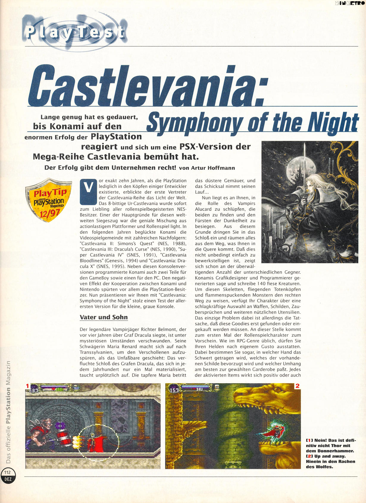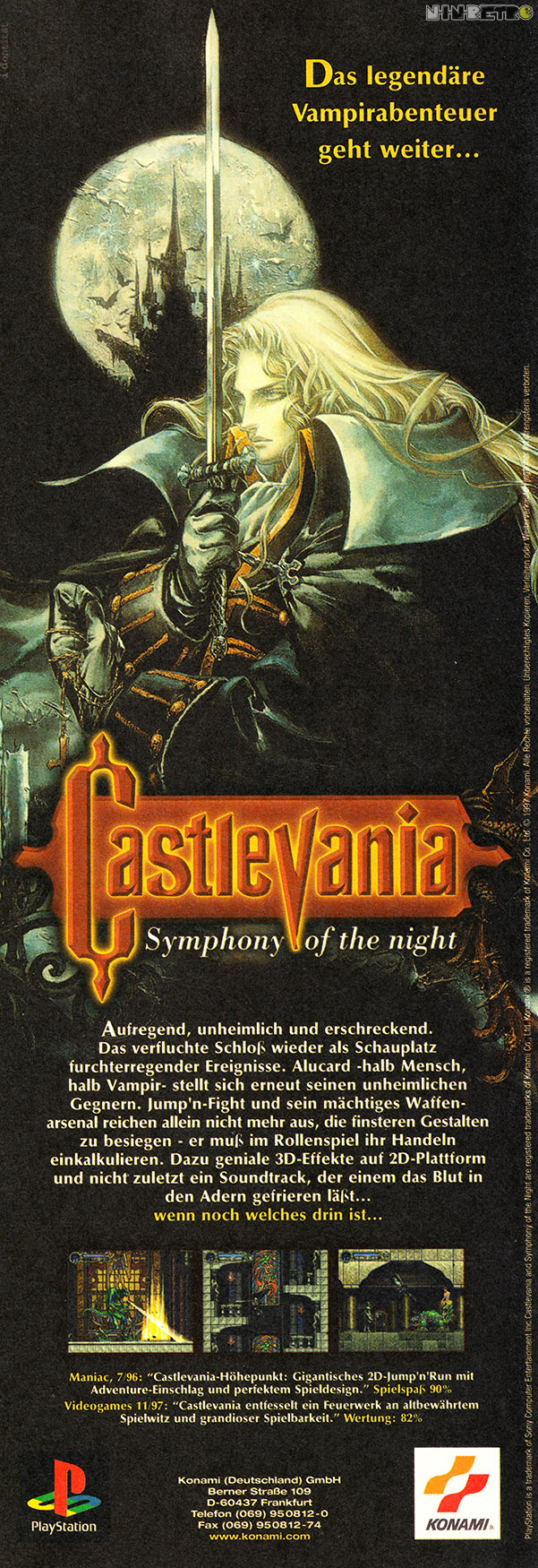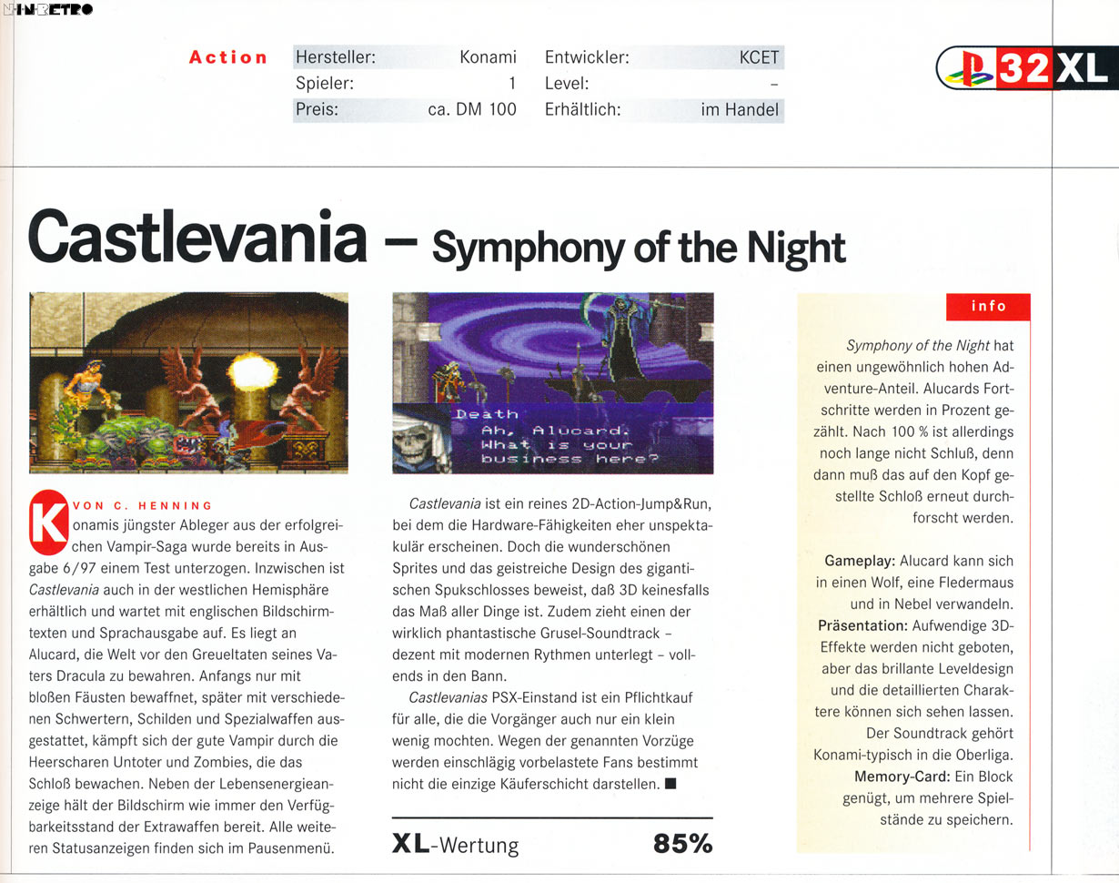 Ich mag das Spiel total. Eine absolute Ohren-Weide das Ganze. Die Musik wurde von der VG mit 82%, Grafik und Sound vernichtend bewertet. Hhmm...ich habe schon damals solche Testberichte gehaßt! Der einzig echte Kritikpunkt war die fehlende 3D-Oberfläche? Da hatte schon das erste Castlevania mehr zu bieten gehabt? Bäh. Das regt mich Heute noch auf. Ich finde das Castlevania SotN eines der schönsten 2D-Abenteuer überhaupt ist. Liebevoll gestaltete Szenen, Hintergründe und Gegner. Die Musik ist für mich der Maßstab auf der Playstation 1. Und ich finde das das Spiel bis Heute nichts von seinem Charme eingebüßt hat. Es ist mein Lieblings-Castlevania.