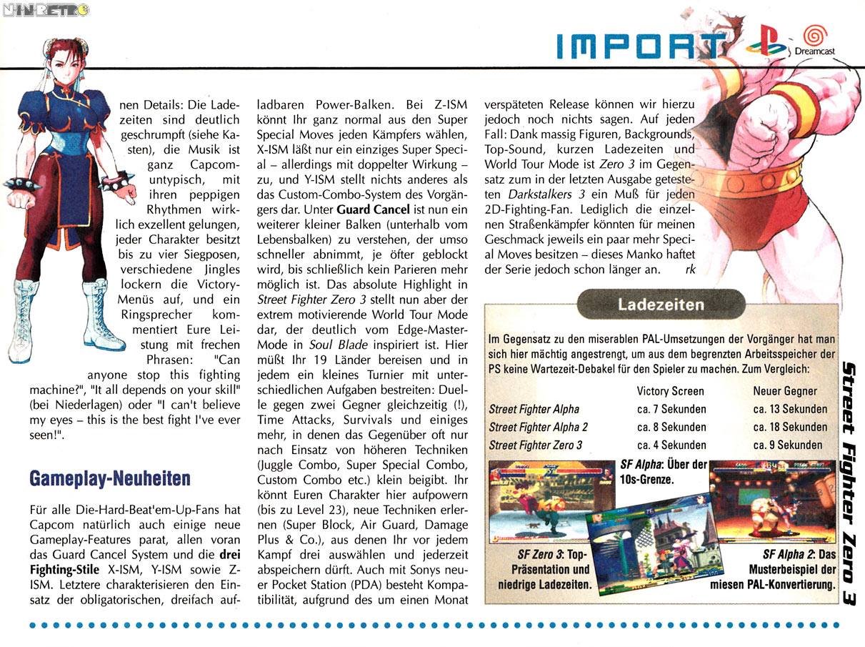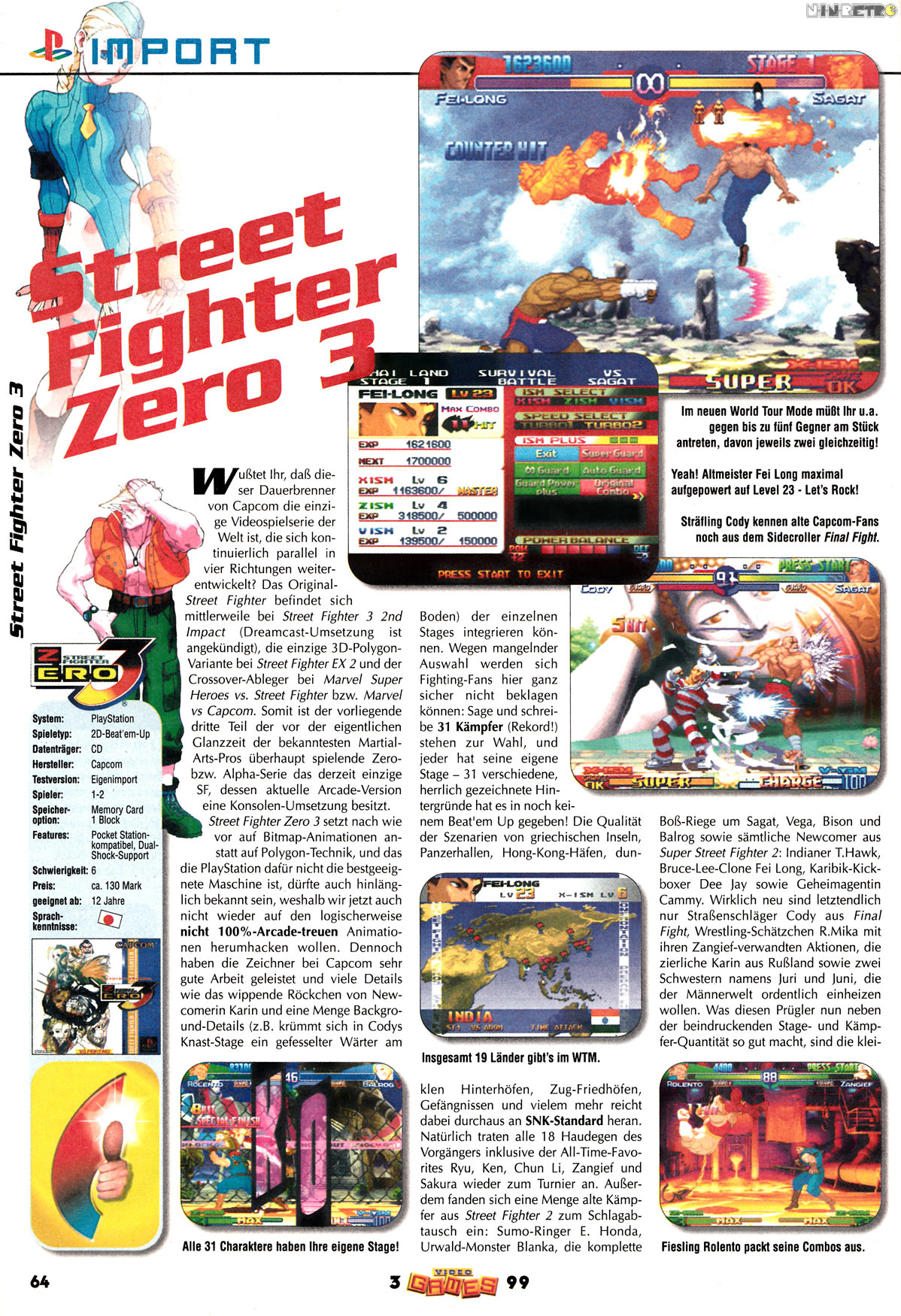 Insgesamt ein gutes Spiel, trotzdem gibt es in meinen Augen (und Ohren!) noch reichlich Verbesserungspotenzial. So gibt es meiner Meinung nach einige überflüssige oder schlecht designte Kämpfer, viele Hintergünde sind langweilig, die Musik ist entsetzlich und das Drumherum viel zu schrill. Außerdem habe ich den Eindruck, als müssten die Special Moves bei diesem Street-Fighter-Teil präziser ausgeführt werden als beispielsweise bei SSF2. Möglicherweise verzieh Letzteres noch das Loslassen des Steuerkreuzes vor dem Tastendruck. Wie auch immer, Street Fighter bleibt Street Fighter, und das taugt in fast allen Versionen, auch in dieser.