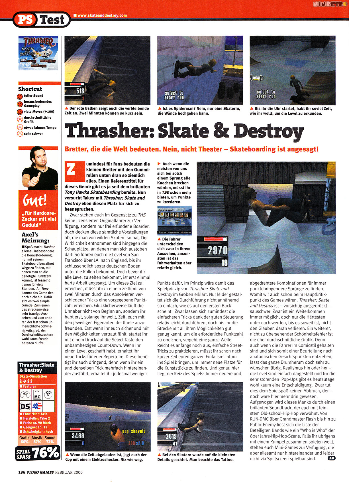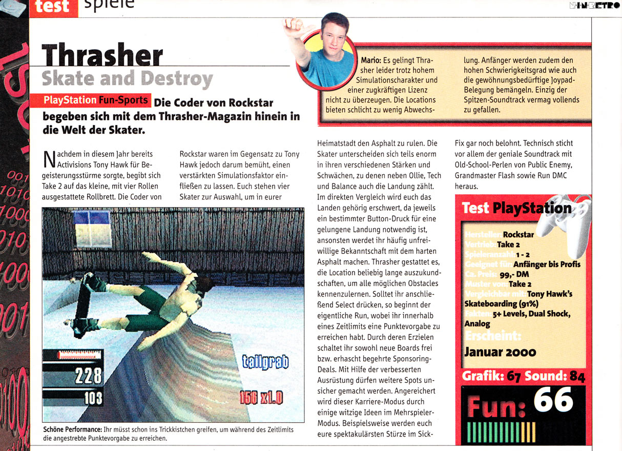 Außerdem hat Thrasher zumindest für meinen Geschmack einen absolut grässlichen Soundtrack. Sich nur auf ein Genre festzulegen ist eigentlich immer ein Fehler. Auch in dieser Hinsicht war Tony Hawk besser.