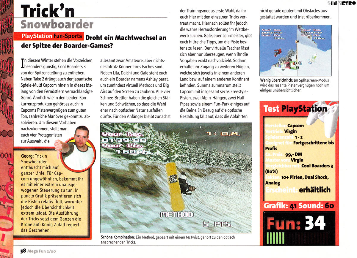 In "Trick'n Snowboarder" kannst Du zwischen den verschiedensten Snowboardern und 10 Kursen inklusive Alphine, Hallpipe, einem Abfahrt Areal oder dem herausfordernden Snowboard Park auswählen. Als Bonus kannst Du noch diverse versteckte Capcom Charaktere freispielen. Alle Fahrer können die verschiedensten Kunststücke auf ihrem Weg durch die kurse vollführen.