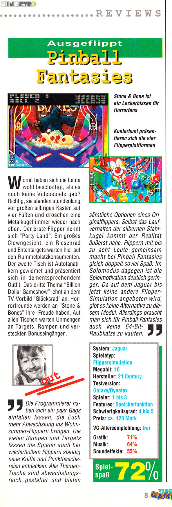 Turn your Jaguar into the ultimate amusement arcade with Pinball Fantasies - the greatest pinball simulator ever. This classic game offers four scorchingly addictive tables with the most realistic ball movement you'll ever seen in a video game. If you're looking for instant playability, speed and excitement, Pinball Fantasies is the game for you.