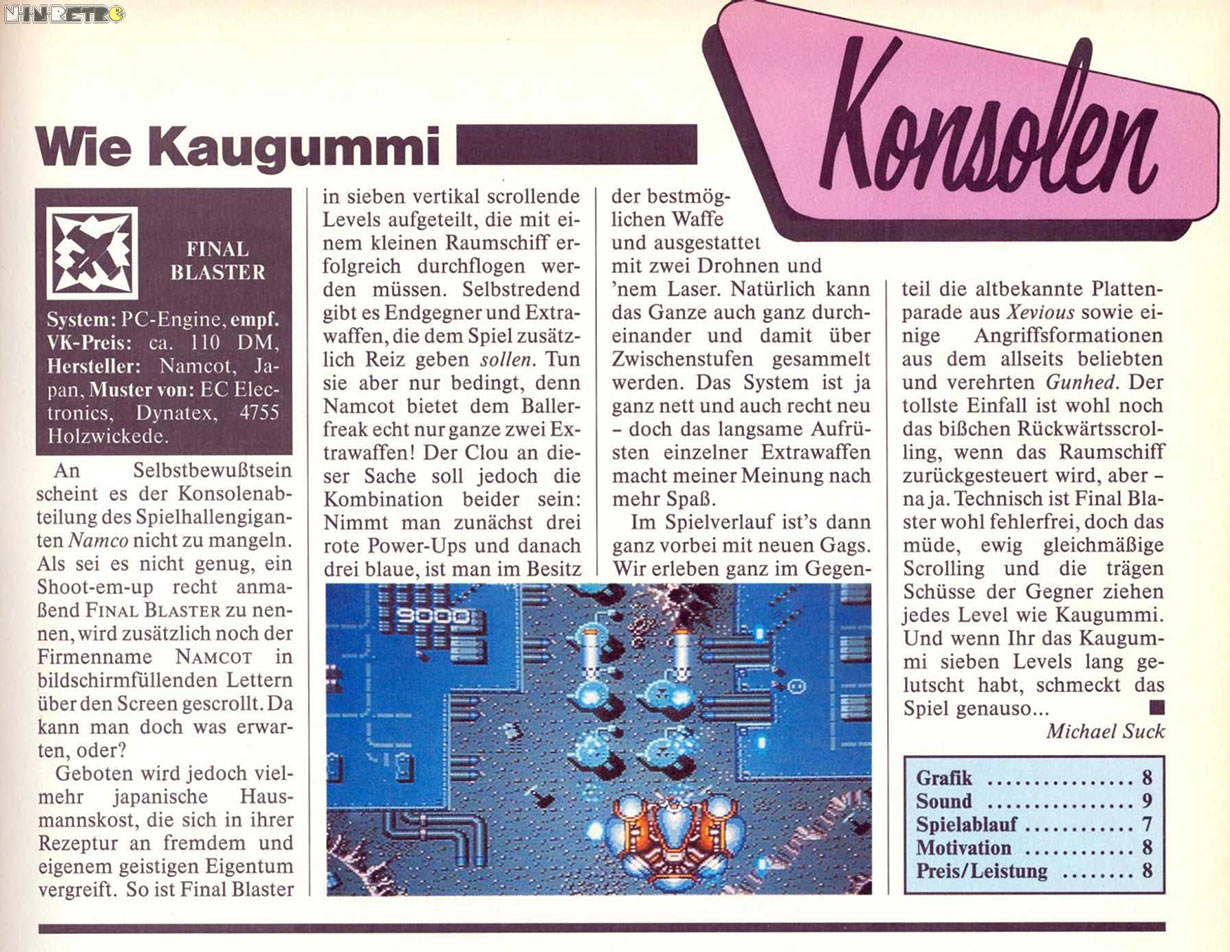 Viel zu hektisch, habe nie den 5. Level erreicht. Davon abgesehen gibt's sowieso viel bessere Ballerspiele auf der Engine (Gunhed, Parodius, Gradius, Mr. Heli etc.etc.etc.).