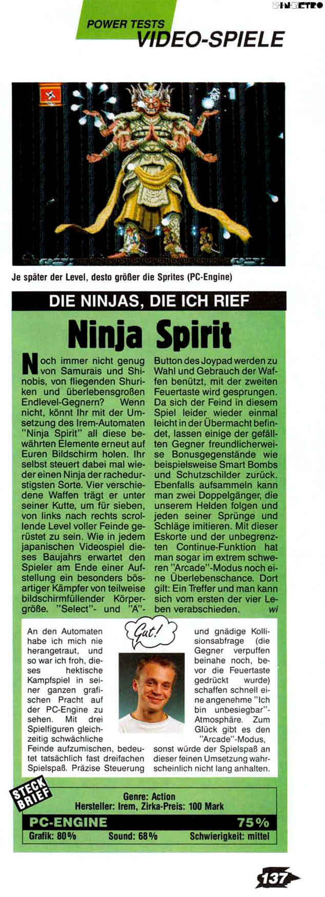 Spielt sich sehr gut. Die Grafik ist super, der Sound klingt leider schlechter als beim Automaten. Trotz PC Engine Mode ist das Spiel ziemlich hektisch, aber auch nicht übertrieben schwer. Leider habe ich den letzten Boss bisher noch nicht erreichen können, weil ich an diesen dämlichen fliegenden (?) Ninjas nicht vorbeikomme...
