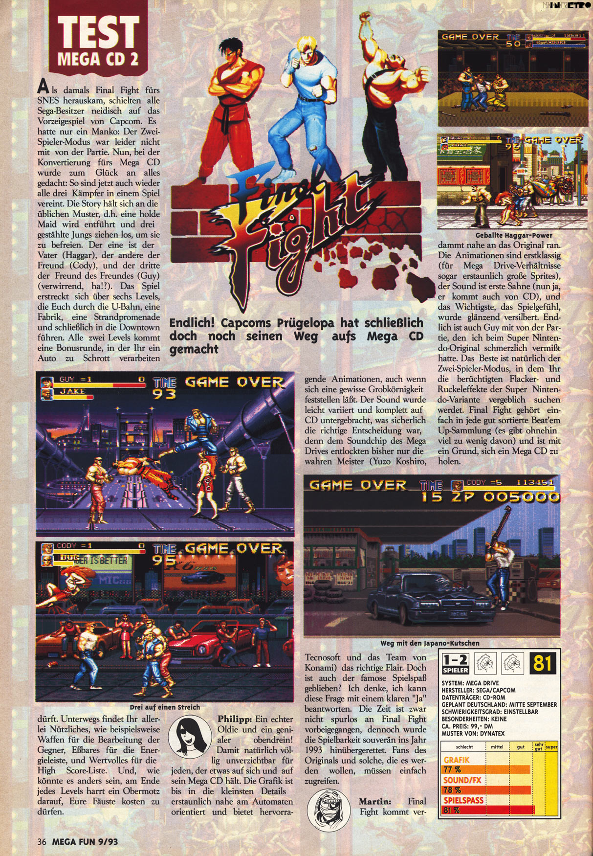 Unter allen Final Fight Ports ist das hier der beste. Der Arcade-Automat kam 1989 in die Spielhallen, diese Version hier erschien 1993. Es ist eine gute Umsetzung. Die 80iger Musik kommt mal richtig gut rüber und paßt zum Setting. Es ist ein gutes Beat´em Up...mehr aber auch nicht. Zu zweit macht es genauso viel Laune wie Double Dragon oder Streets of Rage. Mir gefällt es.