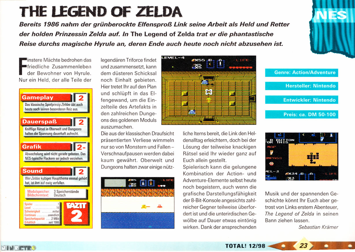Ach ja: Ich glaube auch, dass es die Club Nintendo-Berichte waren, in denen so ausführlich erzählt wurde. Zu der Zeit, als ich das las, hatte ich nen Game Boy (meinen ersten von dreien) und Gargoyles Quest als zelda-ähnlichstes Spiel (und blickte als Drittklässler natürlich nix in Sachen Englisch). Master System kam später dazu und noch viel später Golden Axe Warrior... Zelda war trotzdem besser.