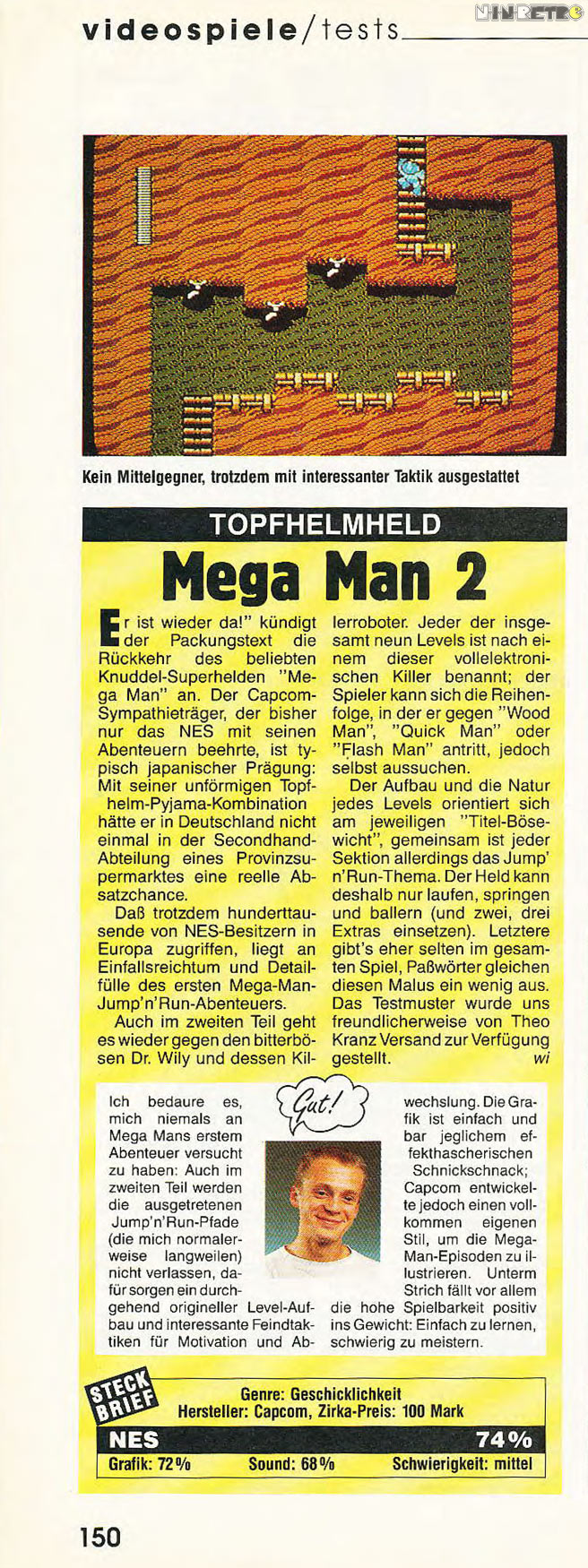 Mega Man 2 ist für mich das beste Mega Man auf dem NES. Zum einen ist die Musik besser, als bei Teil 3 und der Schwierigkeitsgrad ist angenehmer.:?