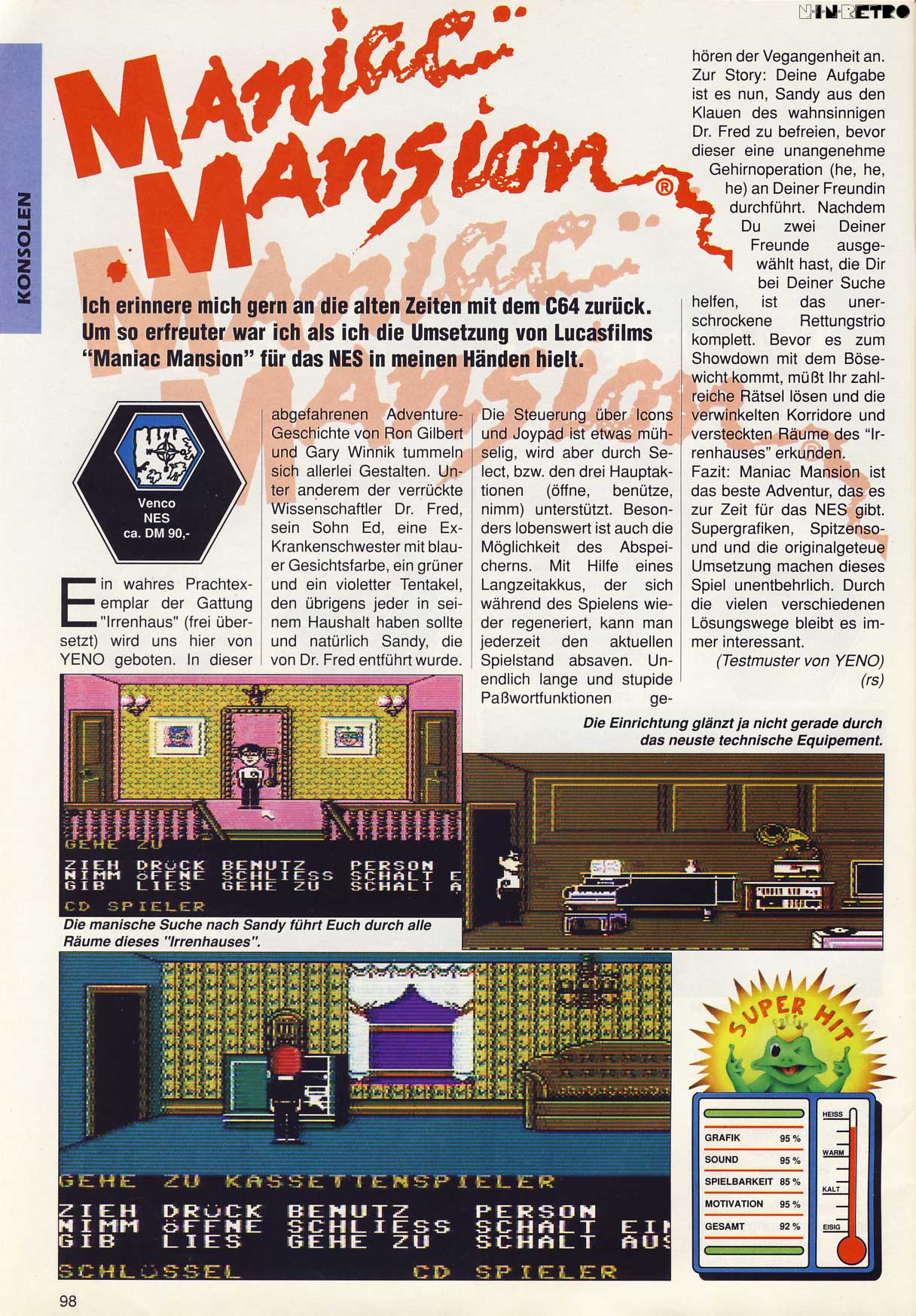 Interessant, dass die Soundwertung der beiden Magazine so unterschiedlich ausgefallen ist. Ich fand den Sound bei "Maniac Mansion" auf dem NES schon immer gut, da liegt die PLAYTIME mit ihrer Bewertung nicht ganz falsch (naja, etwas übertrieben, aber näher an der "Wahrheit" als die Video Games)...