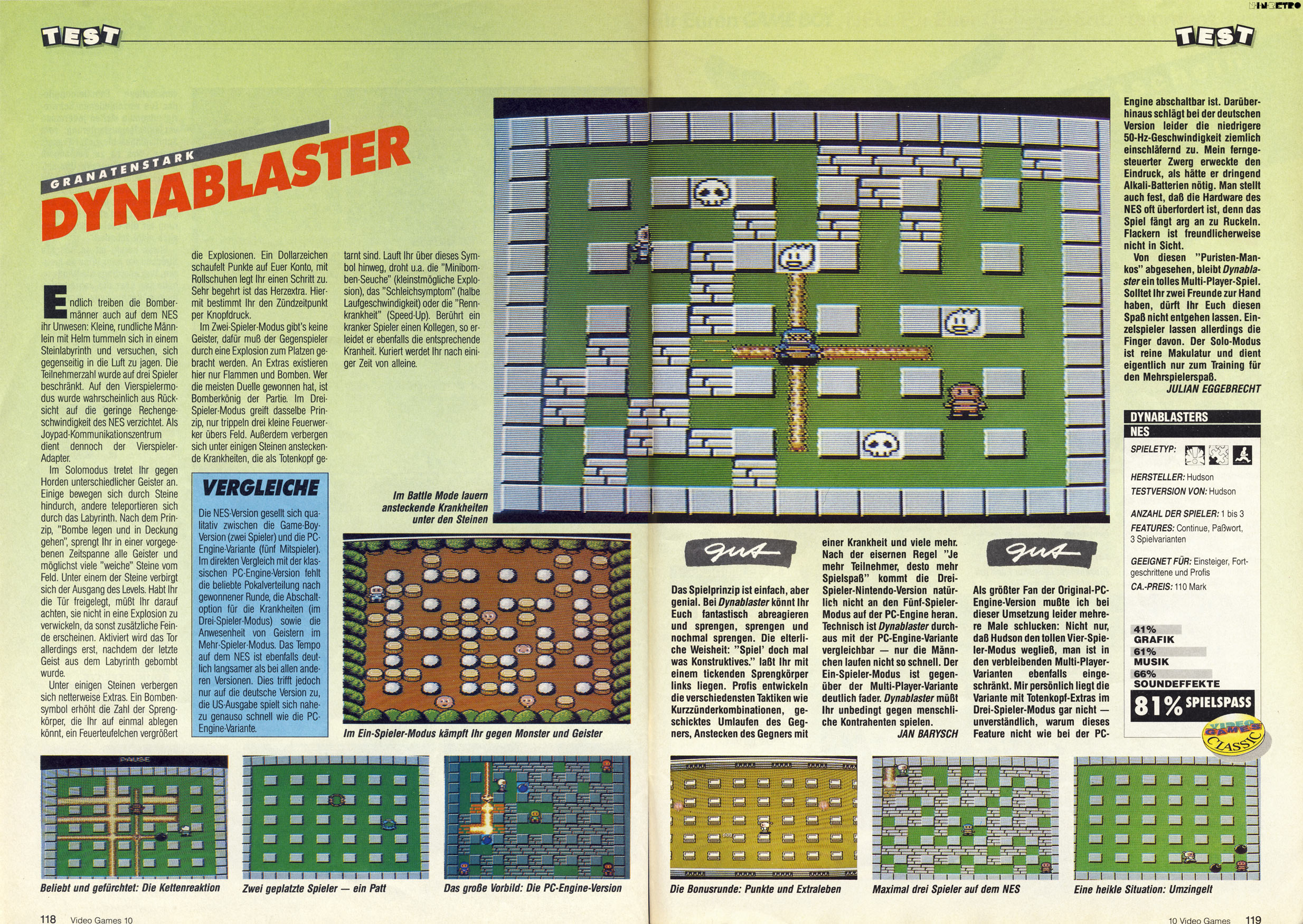 Ein tolles Spiel. Grafisch vielleicht nicht die Eins, aber Spielerisch und besonders der 2-Player-Mode sind einfach nur genial. Egal auf welcher Konsole. Ich finde "Dynablaster" ist ein klasse Spiel. Simpel und effektiv. Coole Power-Ups. Was mich ein wenig genervt hat, sind gelegentliche Slowdowns. Besonders im Bonuslevel.