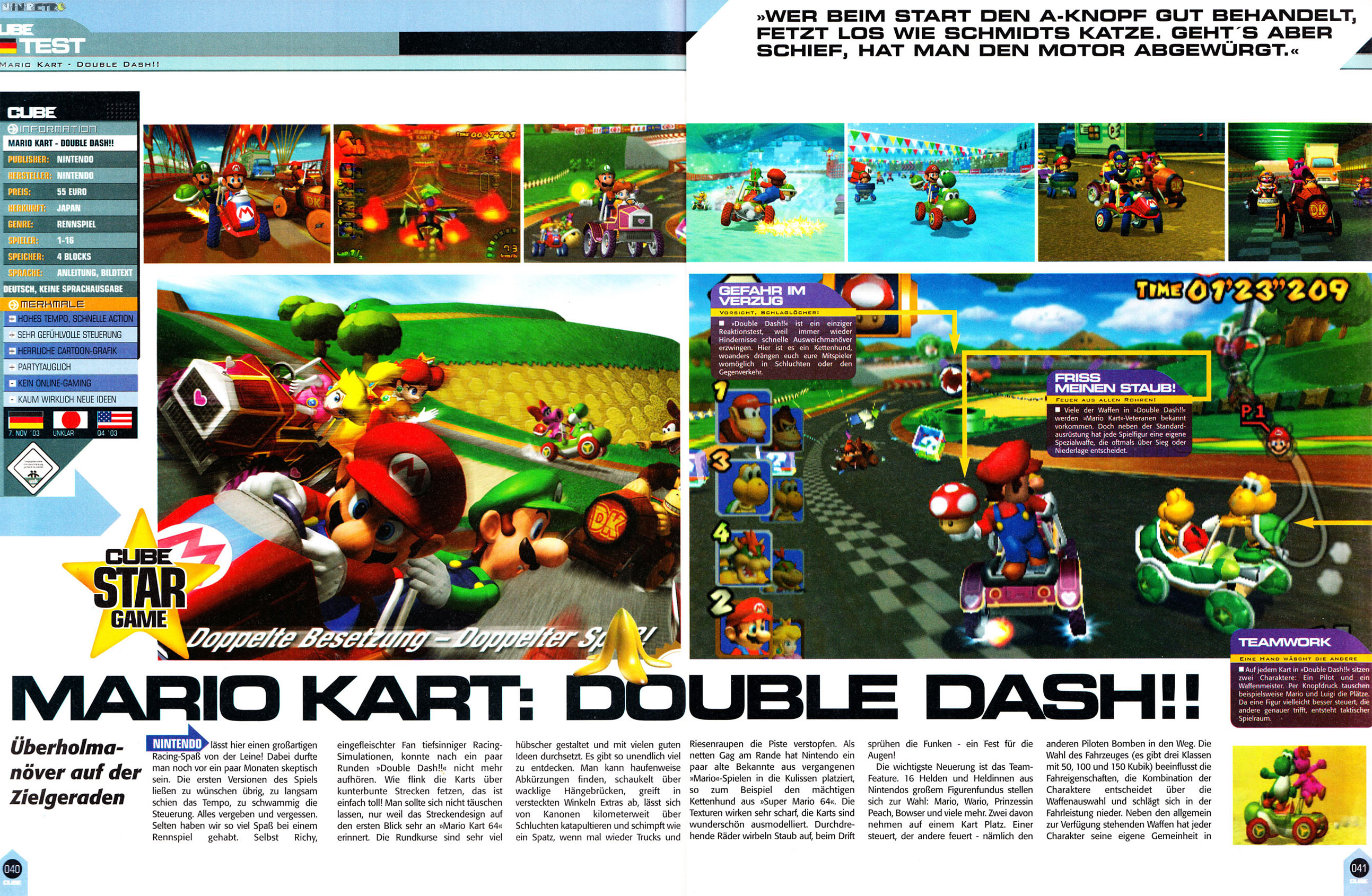 Man nehme die wahnwitzige Action der berühmt berüchtigten Vorgänger der Mario Kart-Serie und... multipliziere diese mit Zwei! Bei Mario Kart: Double Dash!! nimmt jedes Kart zwei Fahrer auf, die jederzeit und beliebig oft ihre Plätze wechseln können! Wähle deine persönlichen Favoriten von der langen Liste der Fahrer und kombiniere sie nach Lust und Laune!