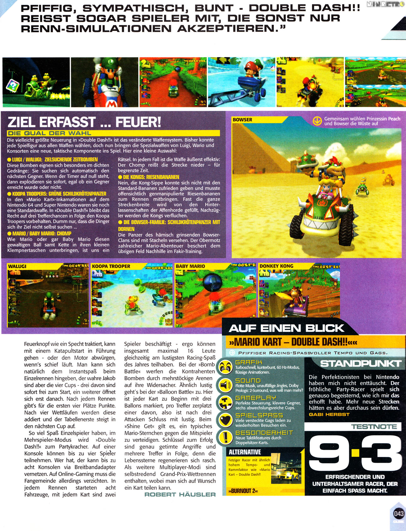 Gerade das Wechseln der Charaktere ist doch super! Wo kann man schon zu viert (!) im einfach geteilten Splitscreen gegeneinander und miteinander zocken? Also wir hatten gerade zu viert mächtig viel Spaß mit dem Double Dash Feature und schön, dass es diesen Teil in der MK-Welt gibt...