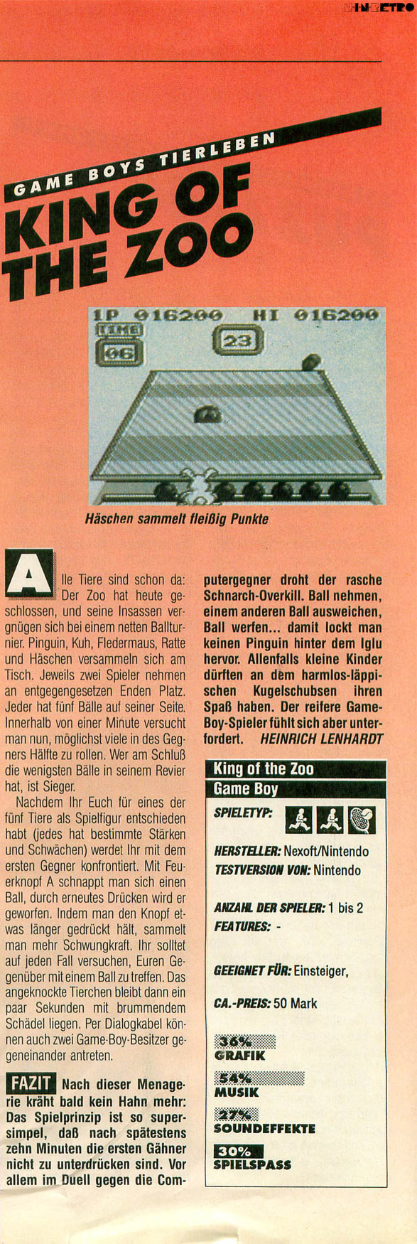 Ich hatte das Spiel damals und die 30% der Video Games finde ich ein bisschen arg wenig. Ok, das Spielprinzip war sehr simpel und im Grund hat man wirklich nur Kugeln hin und her geworfen, dennoch hat es mir Spaß gemacht und für ein Spielchen zwischendurch war es immer wieder gut. Leider konnte ich es nie zu zweit spielen, da man ja ein zweites Modul brauchte und ich leider niemanden kannte, der King of the Zoo hatte. Ich glaube im 2-Player-Modus hätte es wirklich sehr unterhaltsam sein können. Da es technisch keine Gurke war, hätte man gnädigerweise zumindest 50% oder sogar etwas mehr vergeben können. Auf dem iPhone werden solche Simpelspiele ja heutzutage oft in den Himmel gelobt.