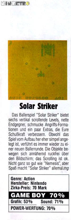Für mich gab's 1989 nur Tetris, Super Mario Land und Solar Striker. "Nemesis" ist zwar der absolute Klassiker, aber auch "Solar Striker" gehörte lange Zeit zu meinen Lieblingsballerspielen.