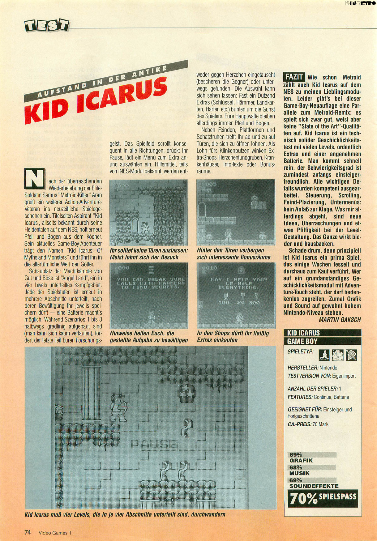 Das Spiel wird einfacher, wenn man ein Dauerfeuerpad benutzt und die Endgegner aus kurzer Distanz erledigt (klappt natürlich nur am Super-Gameboy...). Grafik und Sound sind für Gameboy-Verhältnisse gut, mir gefällt's besser als die NES-Version!