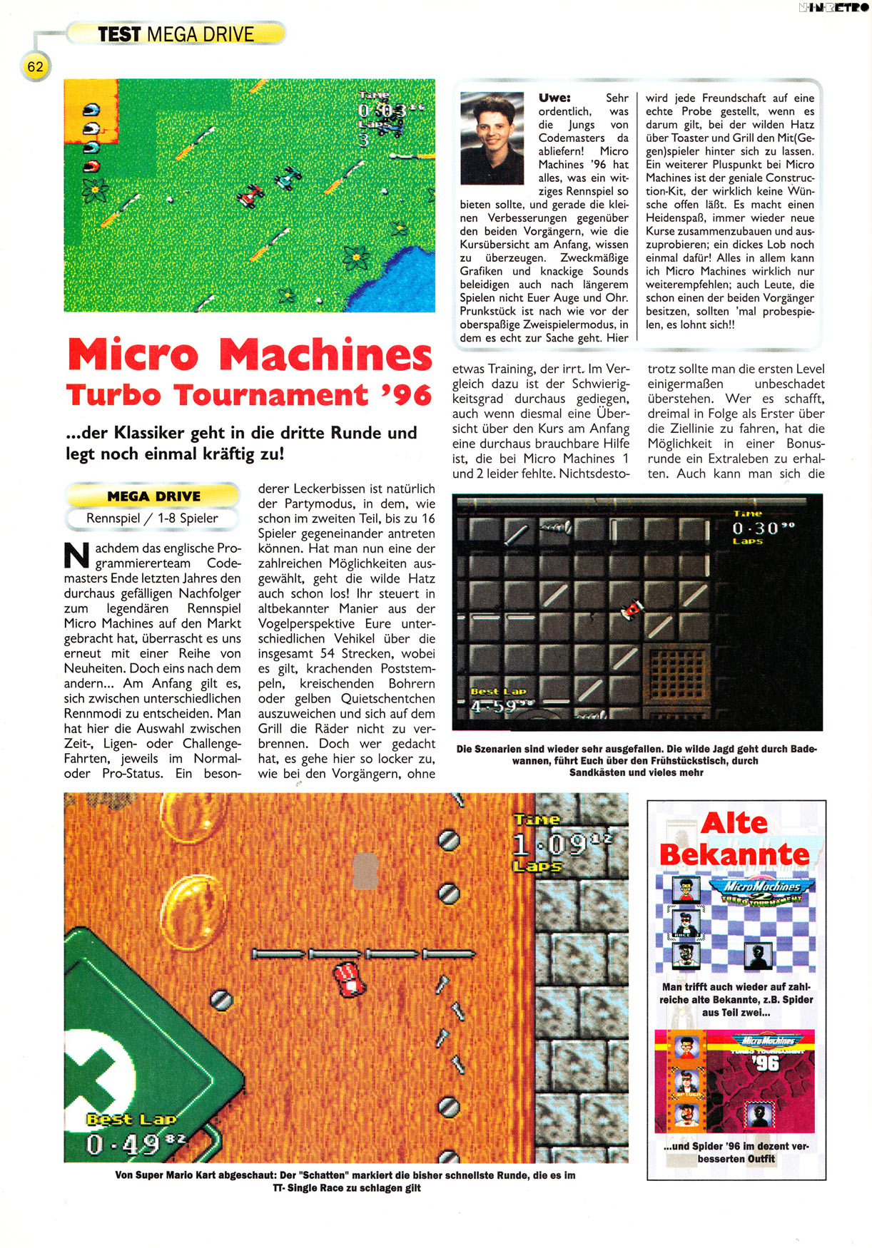 Eigentlich ein super Spiel, aber der Schwierigkeitsgrad ist schon ziemlich heftig. Bis man alle Runden im PRO CHALLENGE-Mode einigermaßen auswendig gelernt hat (was in diesem Spiel lebenswichtig ist), bedarf es einiger Übung. Die Gegner sind einfach viel zu gut. Das Construction Kit ist auch nicht schlecht, aber leider kann man hier nicht gegen den Computergegner antreten, und es fehlt ein Grafikeditor. Genau wie der Vorgänger spielt sich auch MM96 auf dem Mega Drive geringfügig besser als auf SNES, jedenfalls kam es mir so vor (liegt wohl am schnelleren Hauptprozessor). Insgesamt also sehr gut, aber nichts für Anfänger...