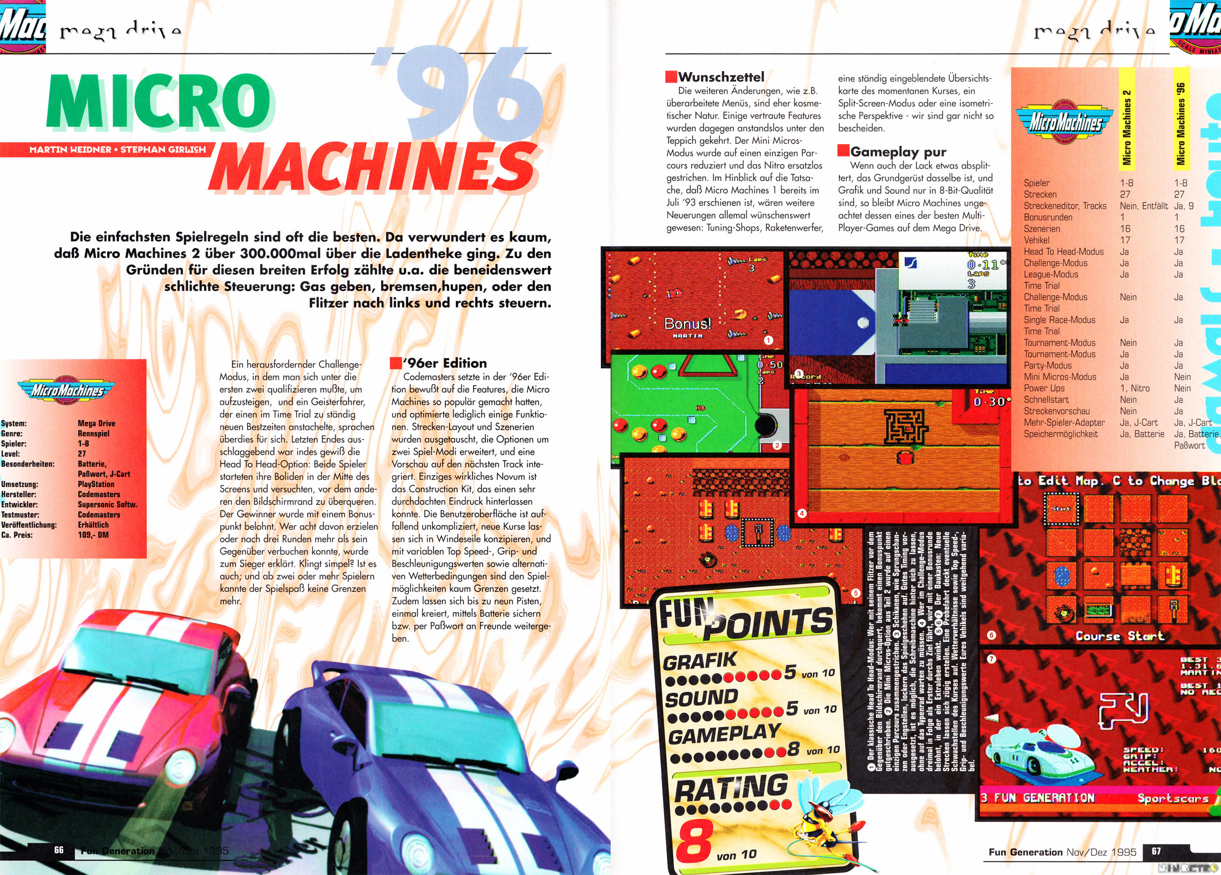 Über 60 spektakuläre Strecken, brandneue Fahrzeuge, noch nie dagewesene Szenarios und die teuflischsten Überraschungen machen Micro Machines 96 zum explosivsten Mega-Spiel! Mit dem einzigartigen Konstruktons-Set haben Sie die Möglichkeit, eigene, maßgeschneiderte Strecken zu entwerfen und auf dem Modul zu speichern!