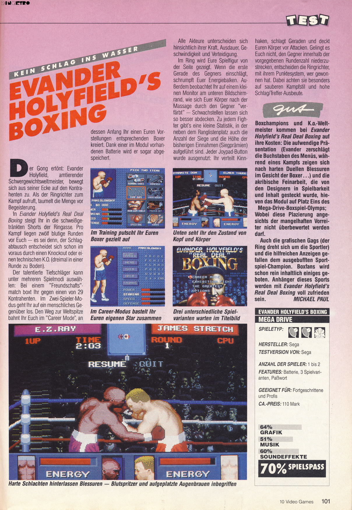 Beef up your contender with power, stamina, speed and defense. You design your own fighter with the name, hands, skin color, hair and trunks you choose. Then rage out of your corner. Challenge 28 power-hitters in exhibition bouts. Win, and pump up with Holyfield-style hi-tech training. Then fight up to the title match.