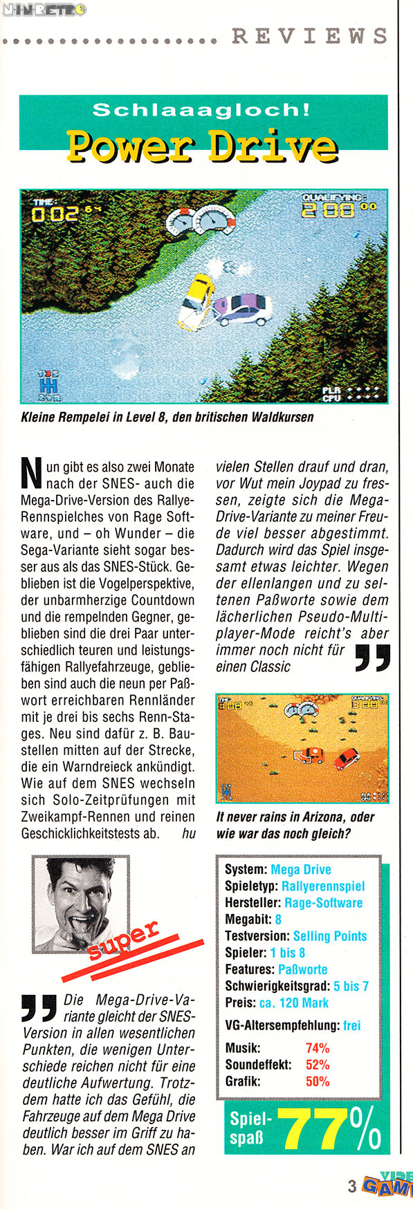 Schade, dass man im Gegensatz zum SNES auf die recht gelungene Musik verzichten muss, wenn man Soundeffekte will. Spielerisch ists aber tatsächlich spürbar besser als die SNES-Version. Auch bei den Nachtfahrten ist die kontraststärkere Grafik auf dem MD ein klarer Vorteil.
