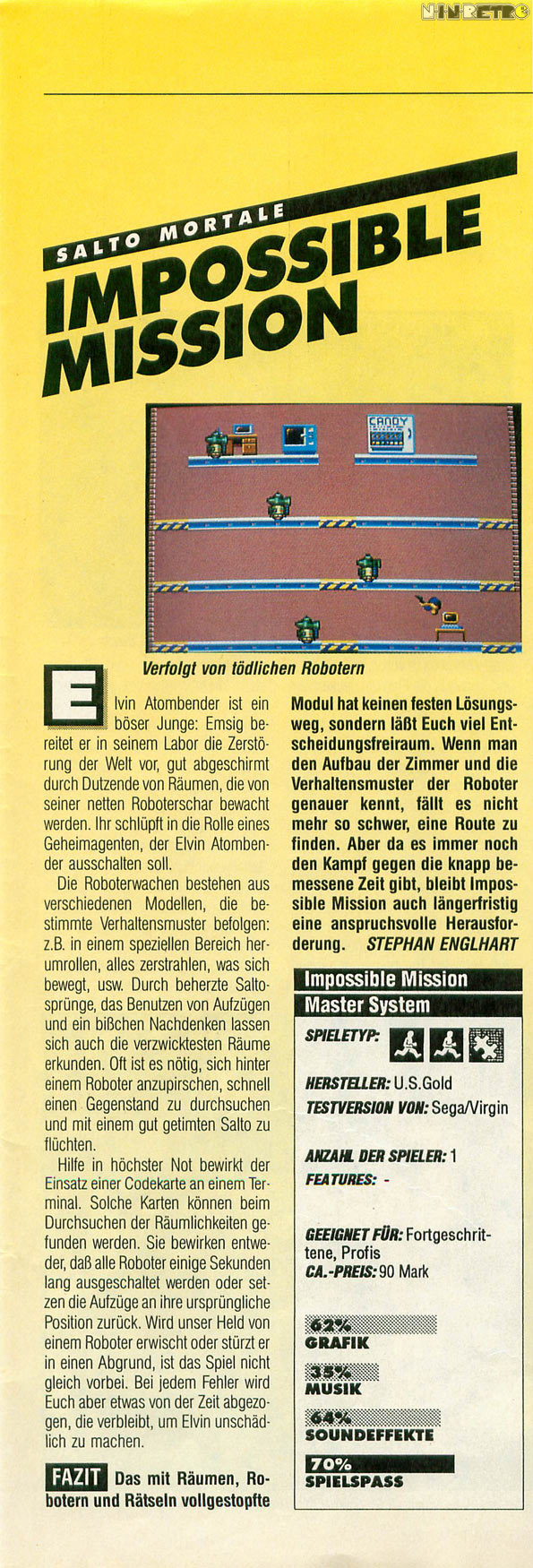 Agent 4125... Verhindern Sie den Versuch von Elvin Atombender in seinem Labor tief unter der Erde, die Welt zu vernichten. Dringen Sie sich durch bis in seine Festung hinein, indem Sie den Wächter-Robotern ausweichen oder sie neutralisieren und gleichzeitig versuchen, den Kode zu erstellen, der Ihnen den Zugang zum Kontrollzentrum ermöglicht. Die Welt wartet voller ANGST. Man bezeichnet Ihre Aufgabe als UNMÖGLICH.