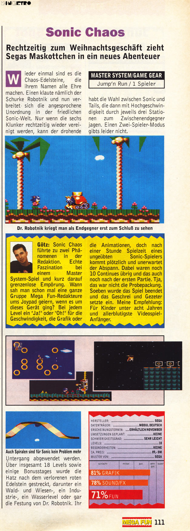Auf dem Gamegear gab's ja noch Sonic the Hedgehog Triple Trouble. Hätten sie das auch ma lieber portiert, das ist nämlich ganz gut! Wobei ich sagen muss, dass mir als Sonic Fan auch Chaos Spaß macht.