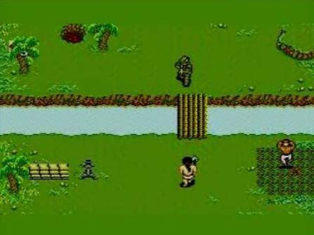 You are Rambo, the super hero of the movies. And you come to life on your own screen. You must go deep into enemy territory to rescue your comrades from concentration camps. Blow those camps. And escape with your skin. It's no picnic. You're menaced by infantry. Artillery. Flame throwers and rocket launchers. Everything the enemy can throw at you. So you must use every tactic at your command. Your weapons? Your M-60. A supply of arrow-bombs. Your savage strength. And steel nerves. Play the game by yourself. Or with your partner. Alone or together, you'll find yourself in the middle of enough color and action for a battalion to take on. And remember. You take no prisoners.