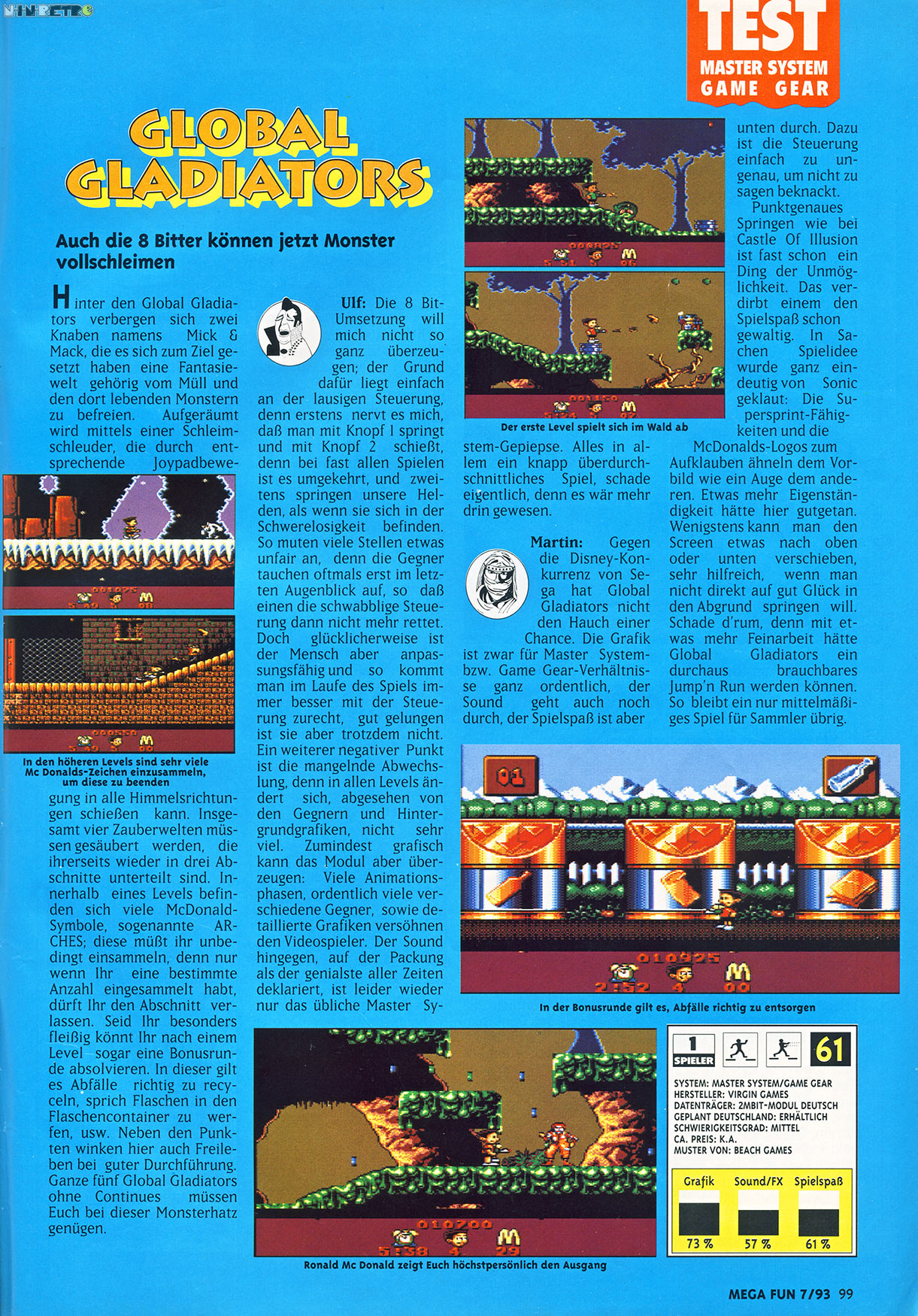 Nimm deine Schleimschleuder und schließe dich Mick und mack, den Global Gladiators an, um die Monster von Slime World, The Mystical Forest, Toxi-Town und Arctic World zu bekämpfen. Sieh Dir die super Hintergrundbilder an, staune über die 1.250 umwefenden Animationen, und hör dabei die genialsten Soundeffekte aller Zeiten!