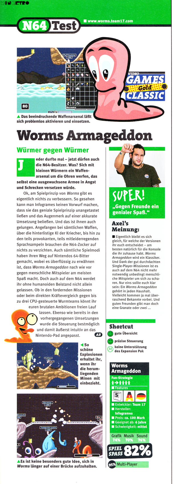 'Dis ain't no fishing game. The ultimate test of strategy pits worm vs. worm throughout 44 missions for 1 - 4 players. Ignite 41 special weapons, like highly flammable old ladies, bouncy banana bombs, and flying sheep, as you inch your way to victory. Devise wickedly ingenious strategies so that your army of worms can wipe THEIR army of worms right off the planet!