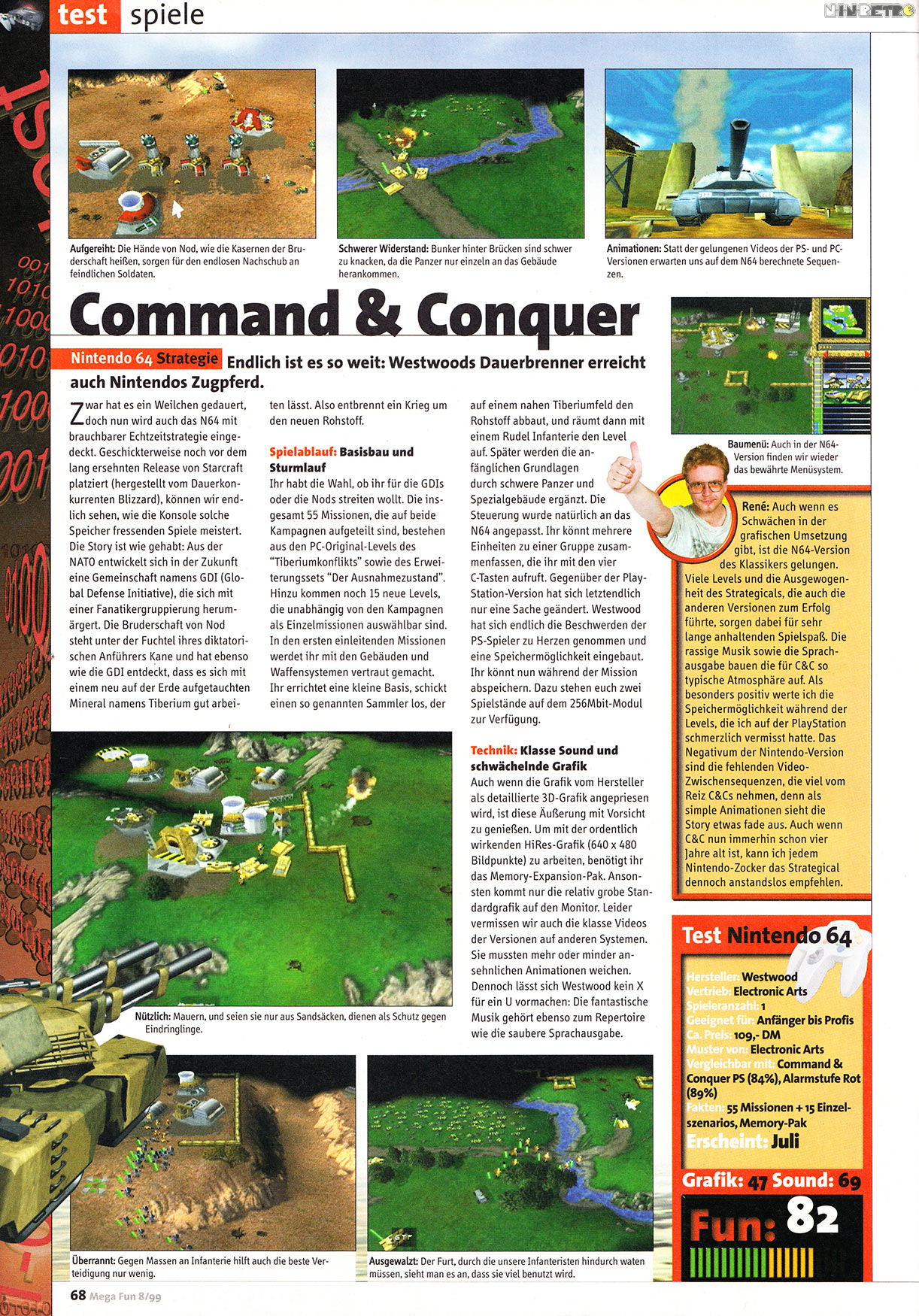 Auf dem N64 ist der Titel für mich eine riesen Enttäuschung. Das fängt bei den Missions-Filmen an. Keine Einleitungsfilme? Ein Standbild und das war´s? Gerade das fand ich in der PC- und PSX-Version so stark. Es ist wesentlich atmosphärischer ein Video zu sehen, als nur ein Bild von einem "Vorgesetzten" und seine Stimme. Das ist für mich schonmal -10%!!! Die Grafik ist eigentlich ganz in Ordnung, nur die Sicht gefällt mir nicht. Es ist eine eigenartige Perspektive, die wie ein Lupen-Effekt aussieht. Was wirklich gelungen ist, ist der Sound. Die Musik und die Soundeffekte sind sehr klar und stimmig. Die Schreie der abkratzenden Soldaten sind aber vielleicht ein bisschen übertrieben. Die Steuerung ist auch nochmal so eine Sache. Man kann damit klarkommen. Aber richtiger Spielspaß kommt bei mir mit dem Stick nicht auf. Zumal es bei Command & Conquer in späteren Missionen durchaus hektisch zugehen kann und man dann auf eine präzise Steuerung quasi angewiesen ist. Alles in allem hätte man diese Konvertierung nicht gebraucht. Zu viele Abstriche muß man bei diesem Titel auf dem N64 machen. Schade schade schade!!!