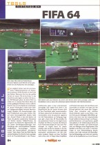 Mit FIFA 64 verbinde ich eine kleine kuriose Geschichte. Da in den Fachzeitschriften der Ausverkauf den N64 schon vor Erscheinen groß propagiert wurde, hatte ich dieses natürlich vorbestellt. Lustigerweise stand das N64 dann beim Erscheinungstermin in jedem Laden vorrätig rum, nur meine Vorbestellung war noch nicht da . Da war ich aber schon voll im N64-Fieber (es hat hat ja auch ewig gedauert bis das Ultra/Nintendo 64 endlich da war). Also musste ich irgendwas machen. Tja, und da hatte ich mir dann FIFA 64 gekauft, welches noch eine Woche (oder länger) dann bei mir ungespielt rumlag bis das N64 endlich bei mir eintraf. Da FIFA damals eigentlich qualitativ schon recht stabil war und es bis dato auch noch keinen Test zu dem Spiel in irgendeiner der Videospielmagazine gab, ahnte ich auch noch nichts Böses. Als ich das Spiel dann das erste Mal endlich spielen konnte war ich natürlich schon ziemlich ernüchtert, ein totaler Rohrkrepierer war es aber auch nicht. Der größte Fehler der bei dem Spiel gemacht wurde, war dass mit steigendem Schwierigkeitsgrad die Spielbarkeit beschnitten wurde. Hat man das Spiel auf schwer gestellt, so konnte man glaube keine Kopfbälle mehr machen. Darunter hatte der Spielspaß schon massiv gelitten, zumal man anfänglich gar nicht gecheckt hatte was da los war.