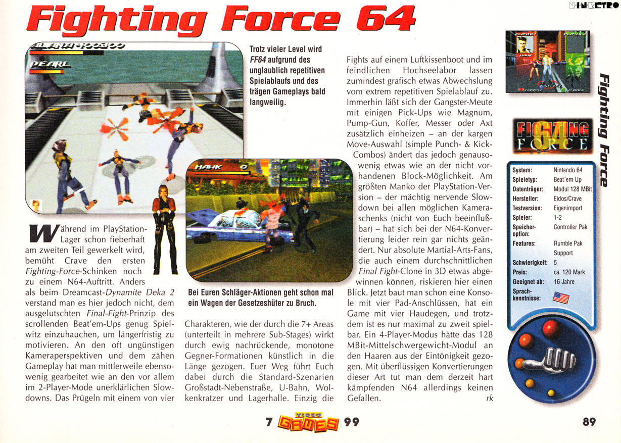 Fighting Force 64 delivers unparalleled action and tons of attack moves in a fully progressive 3D environment. Smash through an anti-tank barricade, pick up a rocket launcher and torch incoming enemies or knock over a vending machine or fuel tanker to find hidden weapons!