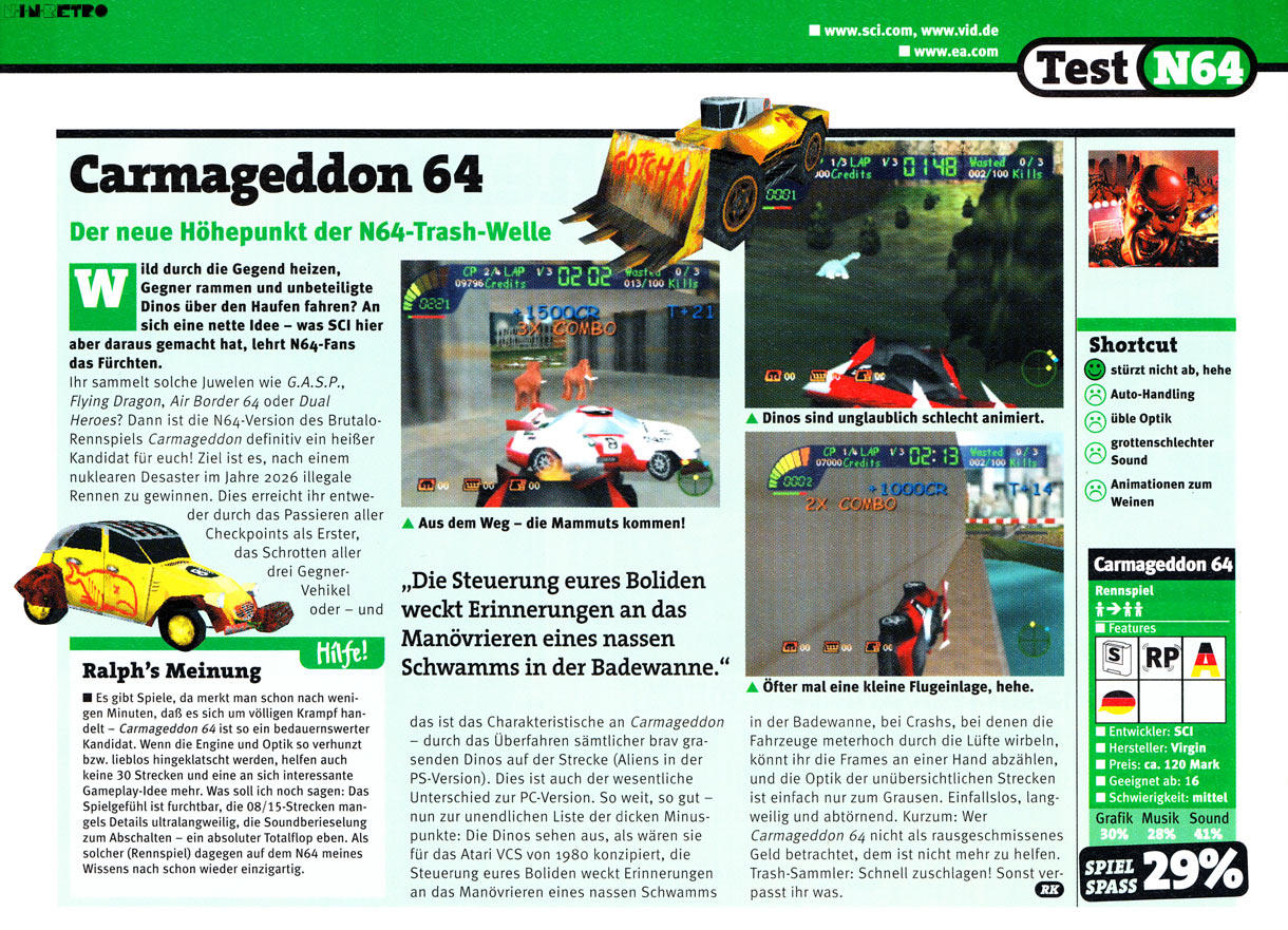 Das Spiel kaufte ich damals teuer auf gut Glück auf einer Elektronik Messe. War wohl der größte Fehlkauf meines Lebens. Die Autos crashen bei jeder Kleinigkeit und dann kann man sich erstmal 30 anschauen wie das Auto auf dem Dach bei einer extrem niedrigen Framerate umher schlittert. Kann mich auch noch an eine Multiplayer Session erinnern, die aufgrund dieser Tatsache ziemlich lustig war, weil mein Kumpel dachte es wäre ein krasses Spiel, hat dann auch ziemlich lange gedauert bis er merkte, dass dem nicht so ist. Musste bei jedem Crash erstmal ordentlich lachen und mein Kumpel hat sich nur gewundert. Aufrgund des für mich einmaligen Trash Faktors eine etwas höhere Wertung von 60 %