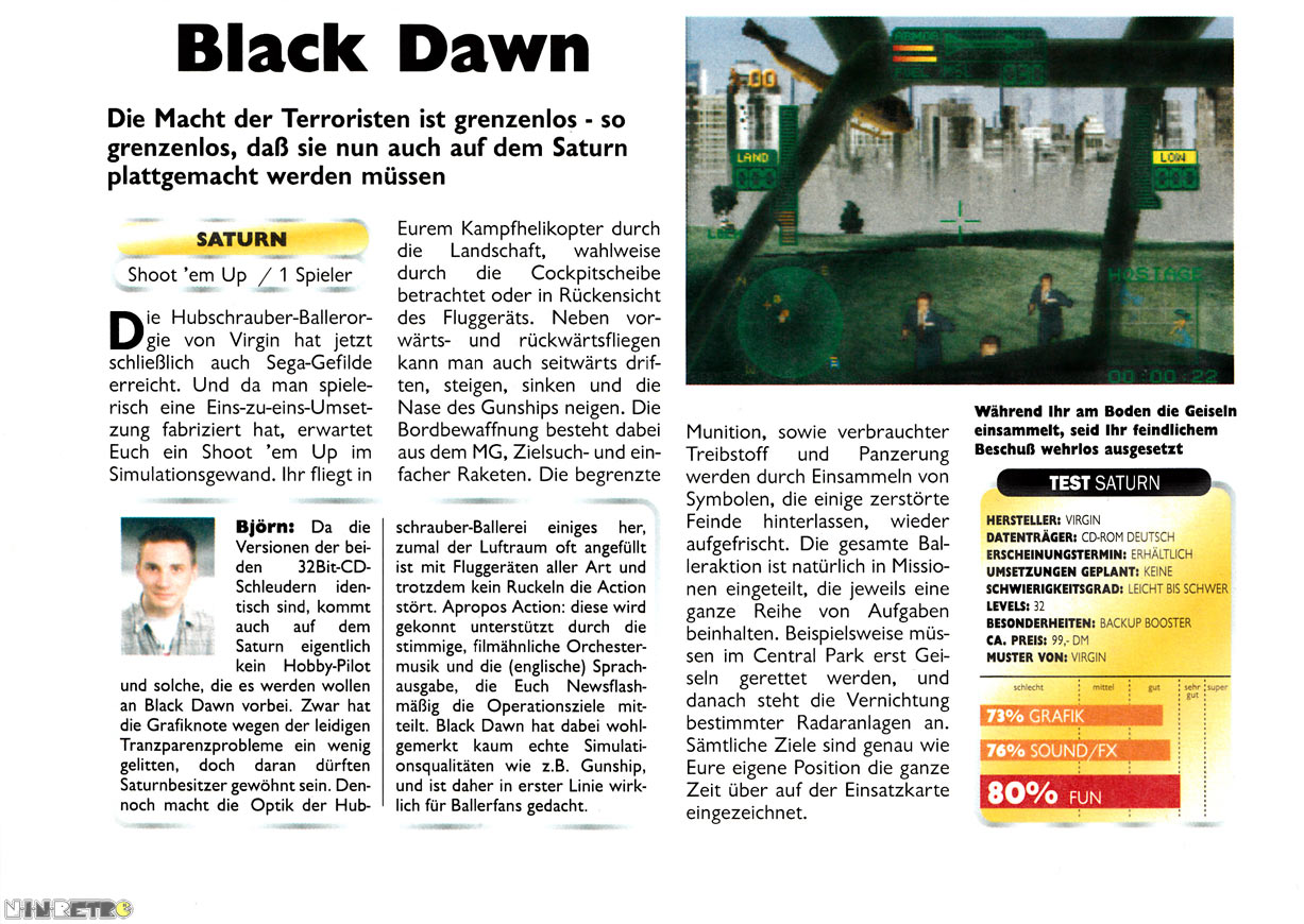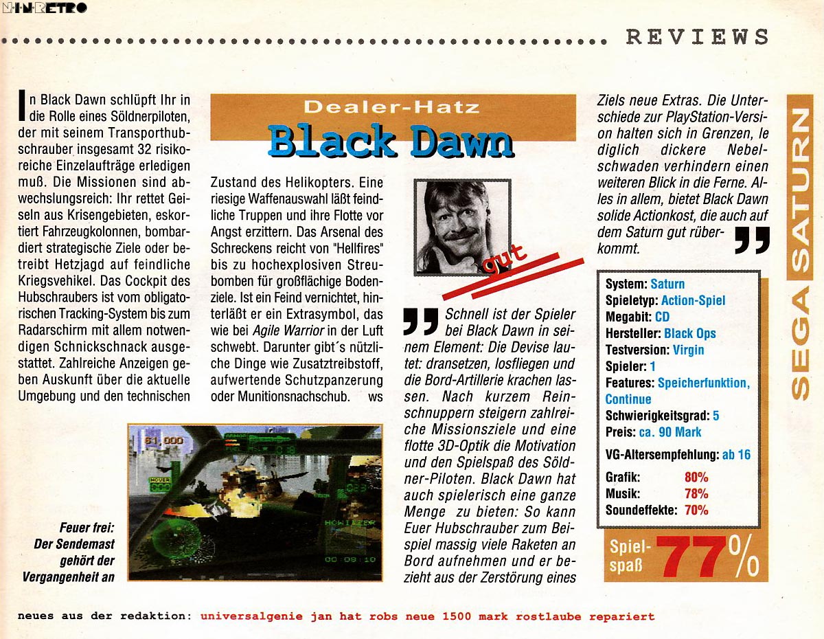 As a member of the top secret Black Operations Unit, you'll decimate enemy forces. Liberate deperate hostages. And navigate your combat chopper through 32 life-or-death missions in this addictive action free-for-all. Black Dawn. You can almost taste the shrapnel.