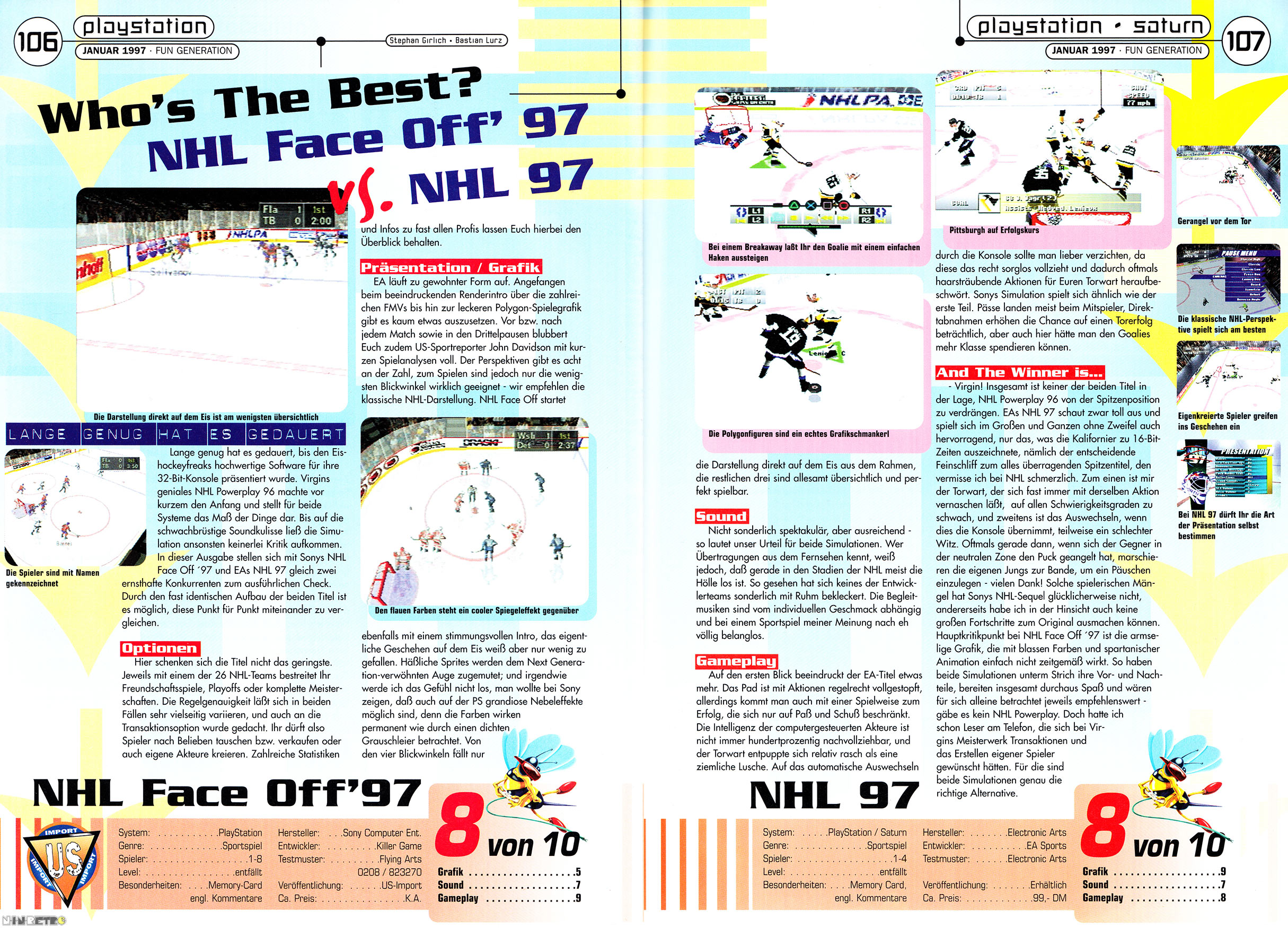 Grafisch und Spielerisch sticht NHL Powerplay. Von der gesamten Aufmachung und den fehlenden Features wie Transfers (was ich schon als gewichtig sehe den jeder NHL Freak baut sich seine eigenen Kader zusammen mit Wunschspielern) oder auch dem Torjubel danach ist NHL 97 vorne.