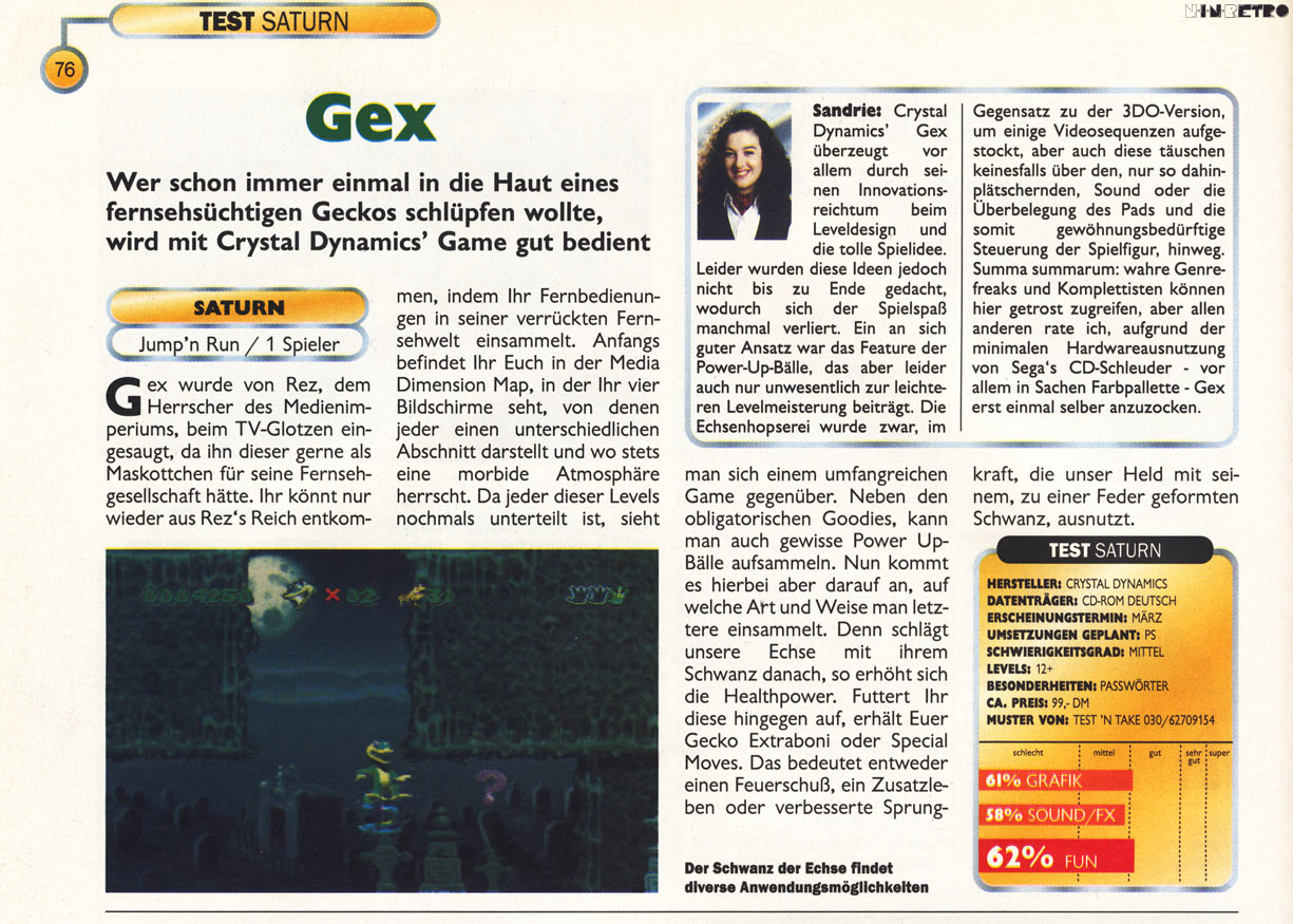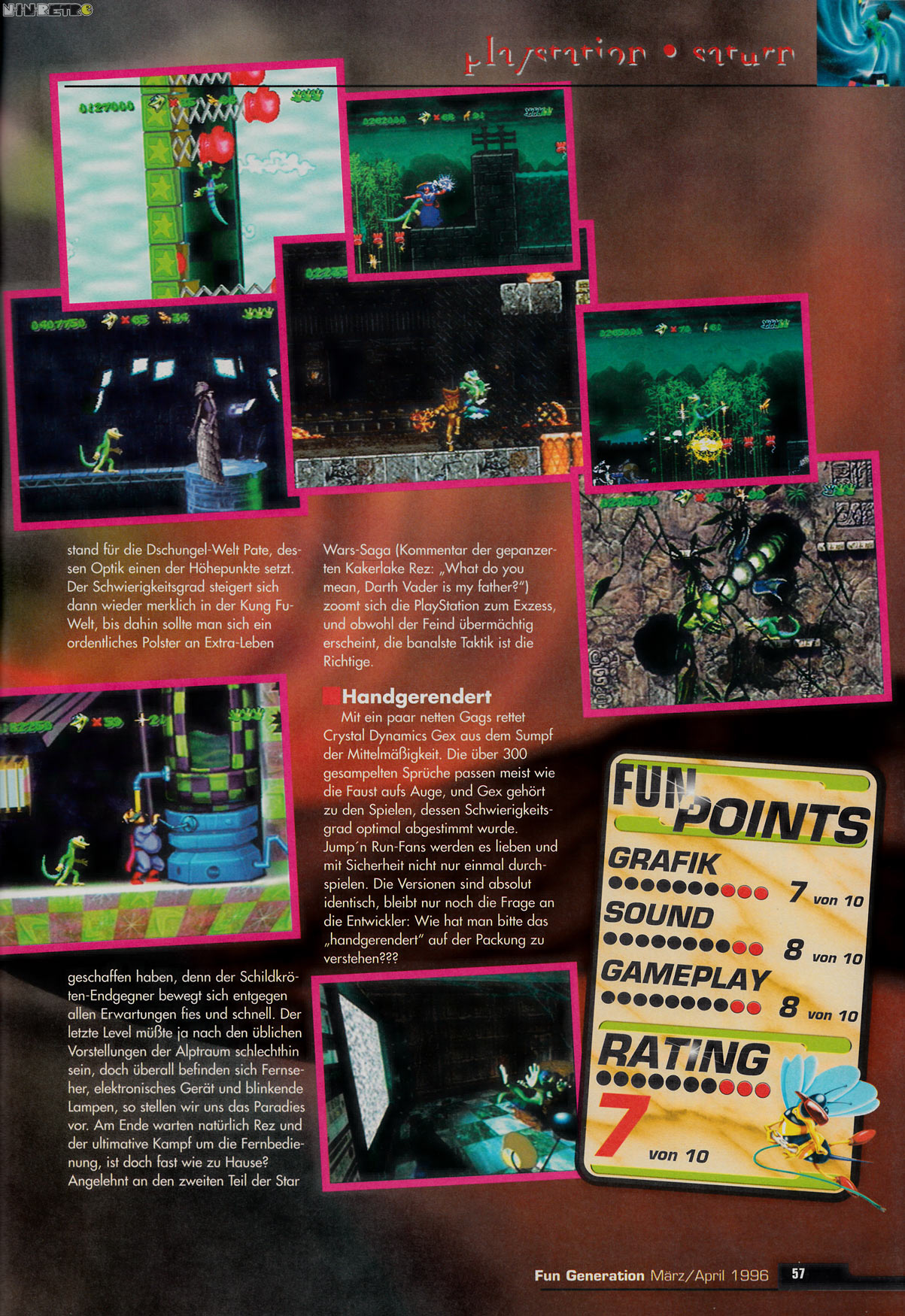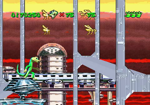 Gex muß mit Hilfe seines peitschenden Schwanzes und seiner Saugpfoten der Mediendimension entkommen! Über 450 Bilder mit 3D-Animation und manuell gestaltetem Hintergrund!