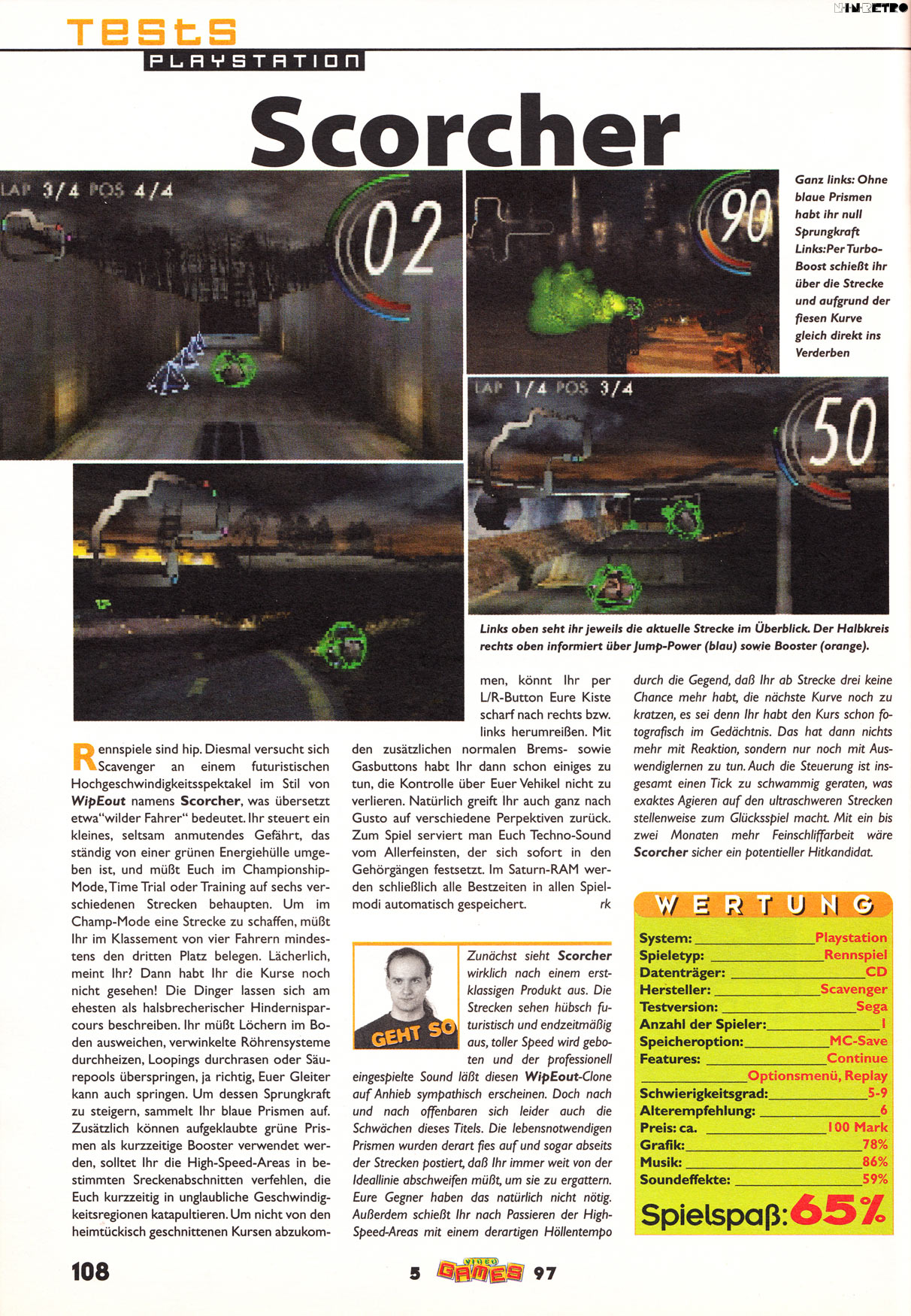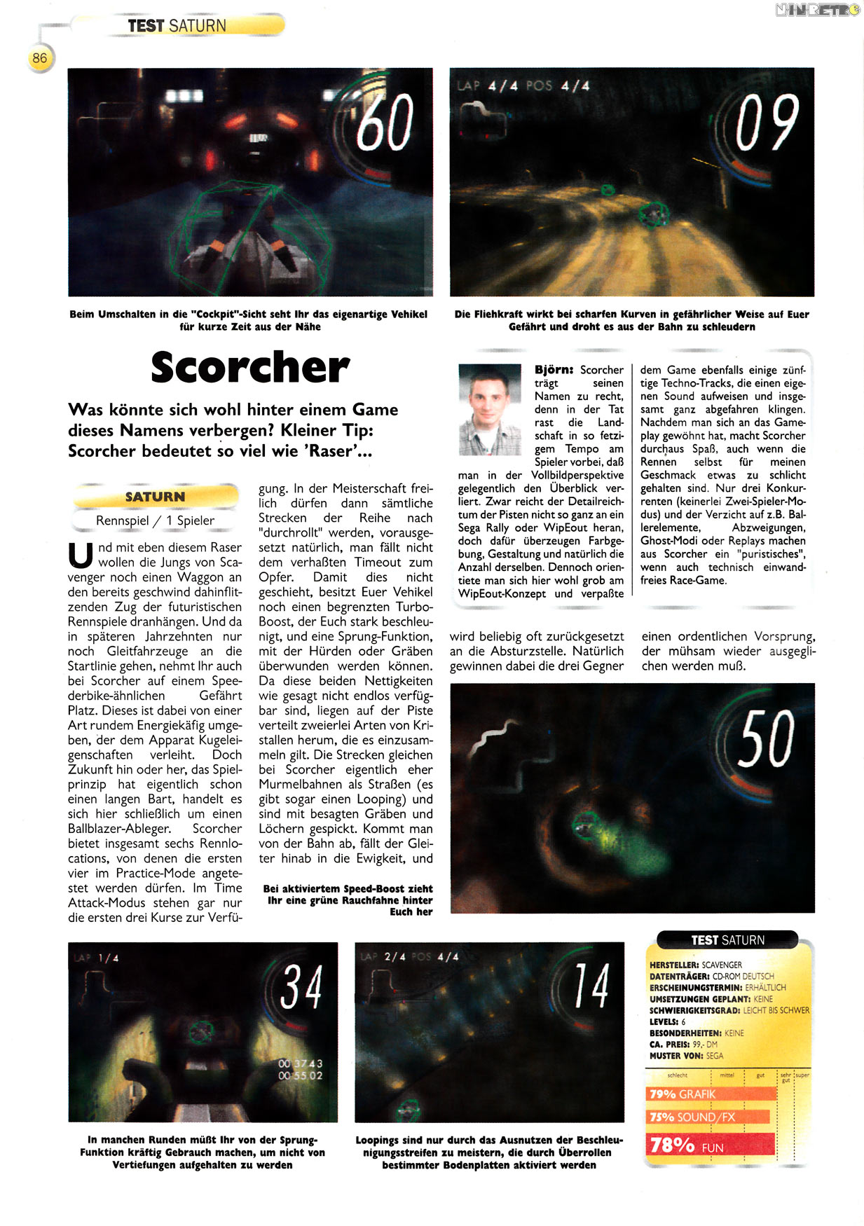 Nein, nein, nein. Scorcher hat vieles, was einen guten Sci-Fi-Racer auszeichnet: Gute Grafik, hämmernder Sound, tolle Atmosphäre und einen eigenen Stil. Aber der Genickbrecher ist die grausam-schlechte Steuerung. Das macht so einfach keinen Spaß, wenn man permanent aus den Kurven fliegt. Schade eigentlich, da wäre wirklich mehr drin gewesen.