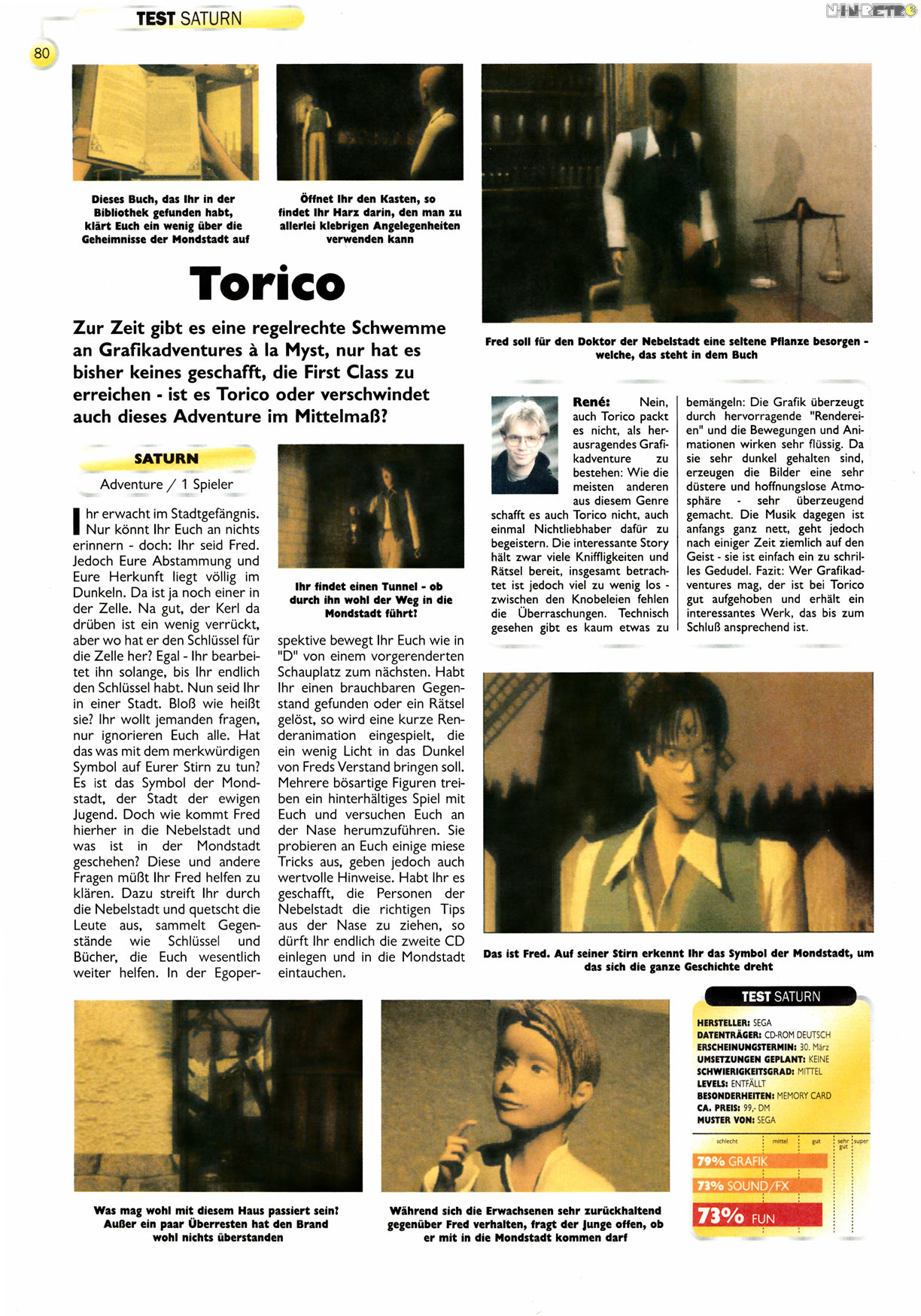 Ich habe es gefunden und mittlerweile die erste von zwei CDs durchgespielt. D habe ich selber bisher nicht gespielt, kann daher nur Anhand von Beschreibungen den Vergleich ziehen. Technisch scheinen die Spiele ähnlich zu sein, man bewegt sich in der Egoperspektive zwischen Bildschirmen hin und her, wobei alle Übergänge durch eine Animation dargestellt werden. Bislang gab es bei Torico aber keine Actionsequenzen, und es würde mich wundern, wenn in der zweiten Hälfte welche kämen. Das Spiel hat auch keine Uhr, die abläuft und dauert auf jeden Fall länger als 2 Stunden.