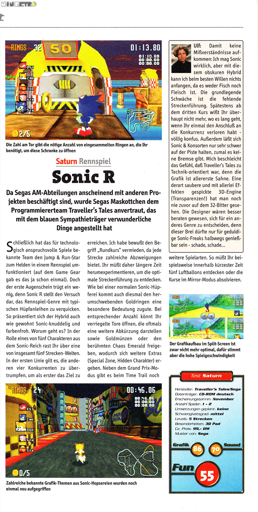 ...eins der schlechtesten Spiele, die ich jemals gespielt habe. Ich hatte es mit einem anderen Saturn-Spiel gekauft, gestartet, 1 min gespielt, rausgenommen und sofort wieder zum Verkauf angeboten - aus heutiger Sicht ist die Grafik eine Katastrophe (und es gibt unzählige Polygonspiele, auch Racer, die die Zeit weitaus besser überstanden haben), die Steuerung ist miserabel (man kann die Figur kaum auf der Strecke halten), und in der Summe bekommt man einfach nur Kopfschmerzen.