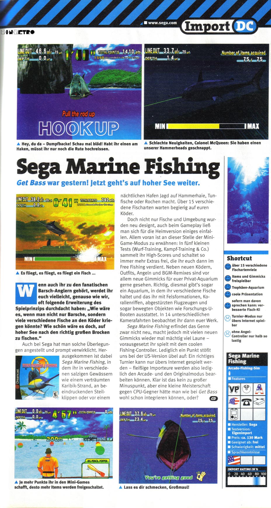 Ein leider sehr kurzes Spiel, das aber unglaublich viel Spielspaß bietet. Sega Marine Fishing muss man unbedingt mit dem Angelcontroller von Sega spielen. Da der Dreamcast einige gute Angelspiele bereit hält lohnt sich diese Anschaffung aber auch.