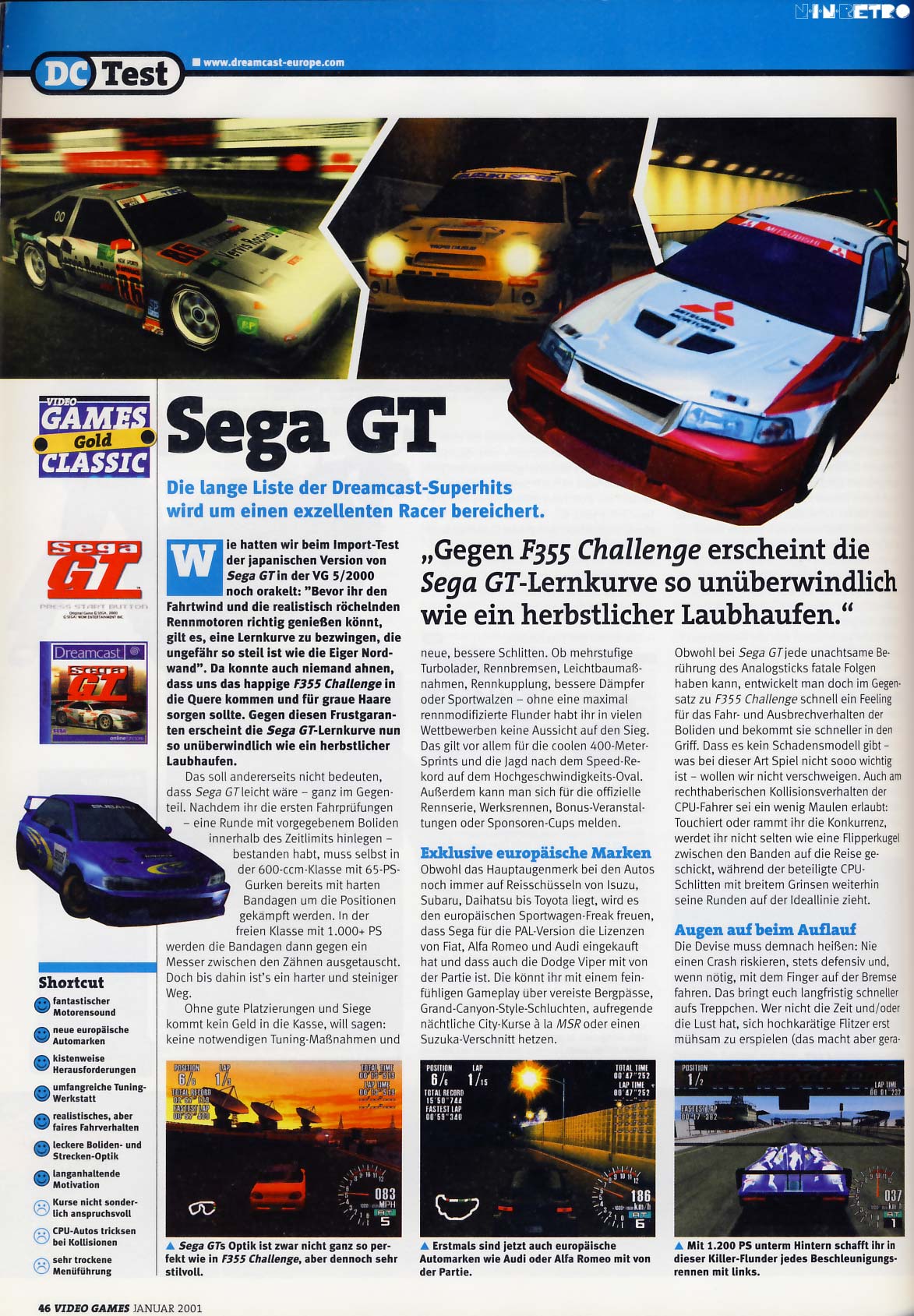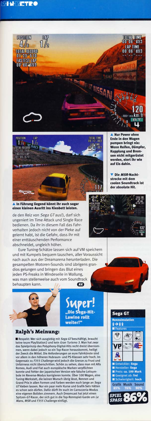 Die Grafik war mehr als ordentlich, die Motorengeräusche ziemlich realistisch und der Umfang hat für viele Stunden vorm Fernseher gereicht. Einzig der Schwierigkeitsgrad hat kaum Fahrfehler verziehen, weshalb ich es auch nicht durch gespielt habe. Es ist allerdings für wenig Geld zu bekommen. Wenn du also ein Spiel suchst, dass die Dreamcast-Hardware gut ausreizt, kann ich es wärmstens empfehlen.